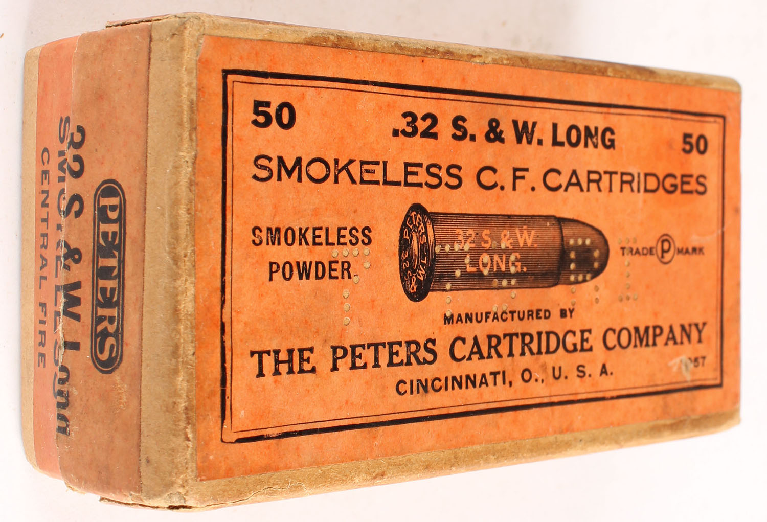 Peters, Smokeless C.F. Cartridges, .32 Smith & Wesson Long, Full, 1pc. Buff & orange box, box is solid with excellent color, minor age soiling, vertical seam splits to all corners of lid, some edge & corner wear, labels are intact, ammo is very good to excellent. Grade: Very Good + - Value: 20 to 60