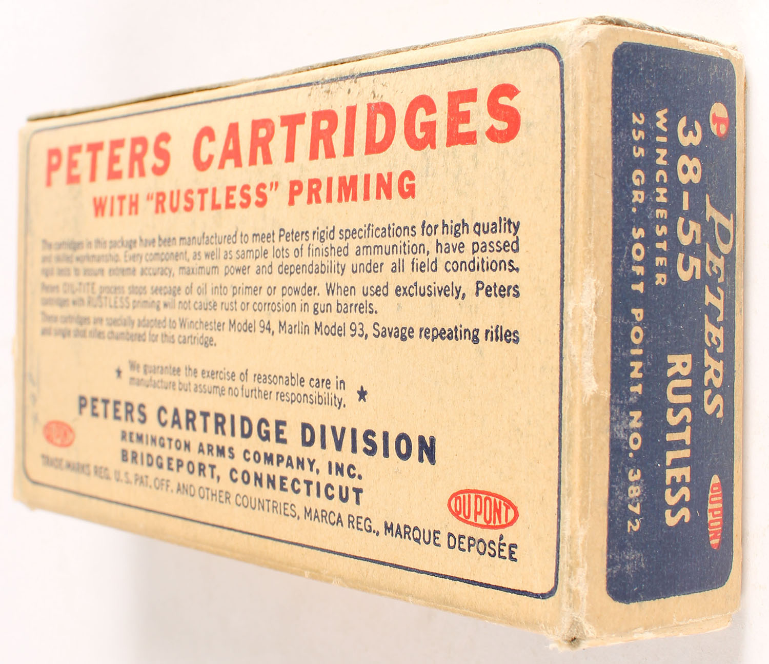 Peters, Rustless, .38-55 Winchester, 255 Grain Soft Point Bullet, Partial 16rds. 1pc. Blue white & red box, box is solid with very good to excellent color, minor age soiling & shelf wear, minor corner wear, edges are crisp, end flaps are solid, ammo is excellent. Grade: Excellent - Value: 20 to 60