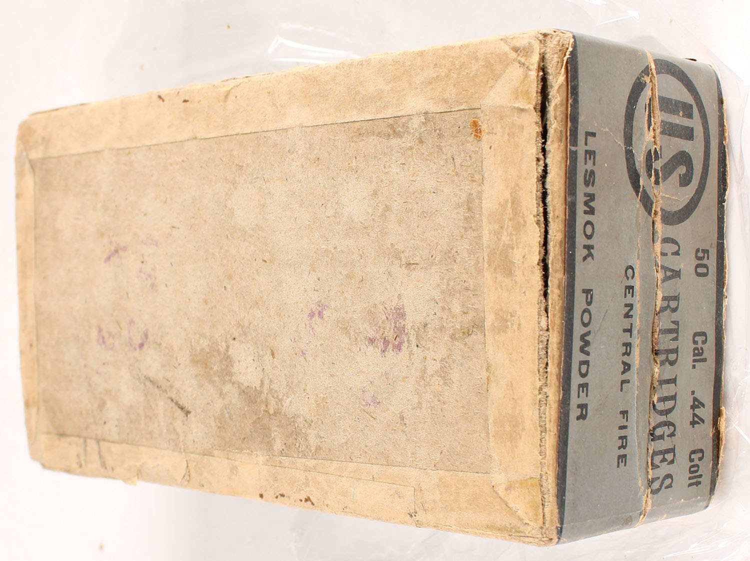 U.S., Central Fire Cartridges, .45 Colt, Lesmok Powder, Full, 2pc. Buff box with blue top & side sealing labels, 3 seam splits to bottom edges, 2 partial seam splits on top edges, good color, minor age soiling, shelf wear, edge & corner wear, labels are intact, ammo is fair. Grade: Fair - Value: 30 to 90