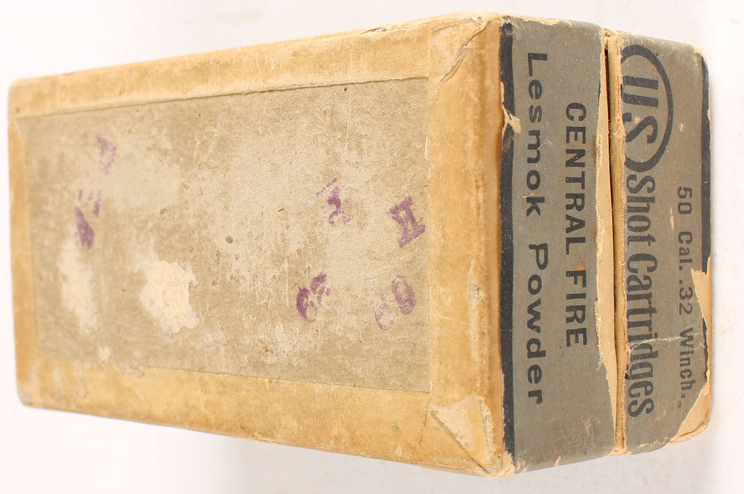 U.S., Central Fire Cartridges, .32 Winchester Shot, Lesmok Powder, Partial 48rds. 2pc. Buff box with blue top & side sealing labels, box is solid with good to very good color, age soiling, some shelf wear, seam splits to top front & right end edges, edge & corner wear, labels are intact, ammo is excellent. Grade: Very Good - Value: 100 to 400