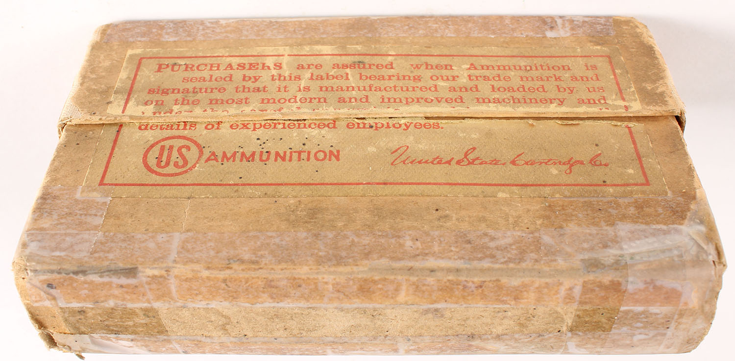 U.S., Smokeless Central Fire Cartridges, .35 Winchester, Metal Cased Bullets, Full of mixed H/S, 2pc. Buff box with orange & red label, box is solid with fair color, age soiling, some staining & shelf wear, entire bottom is taped, tape on front edge of lid, seam split to left edge of lid, edge & corner wear, top label is intact, ammo is excellent. Grade: Fair ++ - Value: 30 to 90