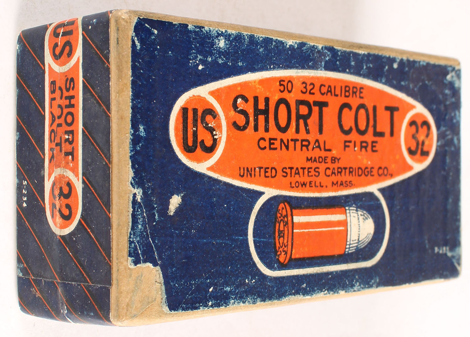 U.S., Central Fire, .32 Short Colt, Black Powder, FULL & SEALED, 2pc. Buff box with blue/orange top & side sealing labels box is solid with excellent color, some shelf wear, very minor corner wear, edges are crisp, labels are intact. Grade: Excellent - Value: 40 to 120