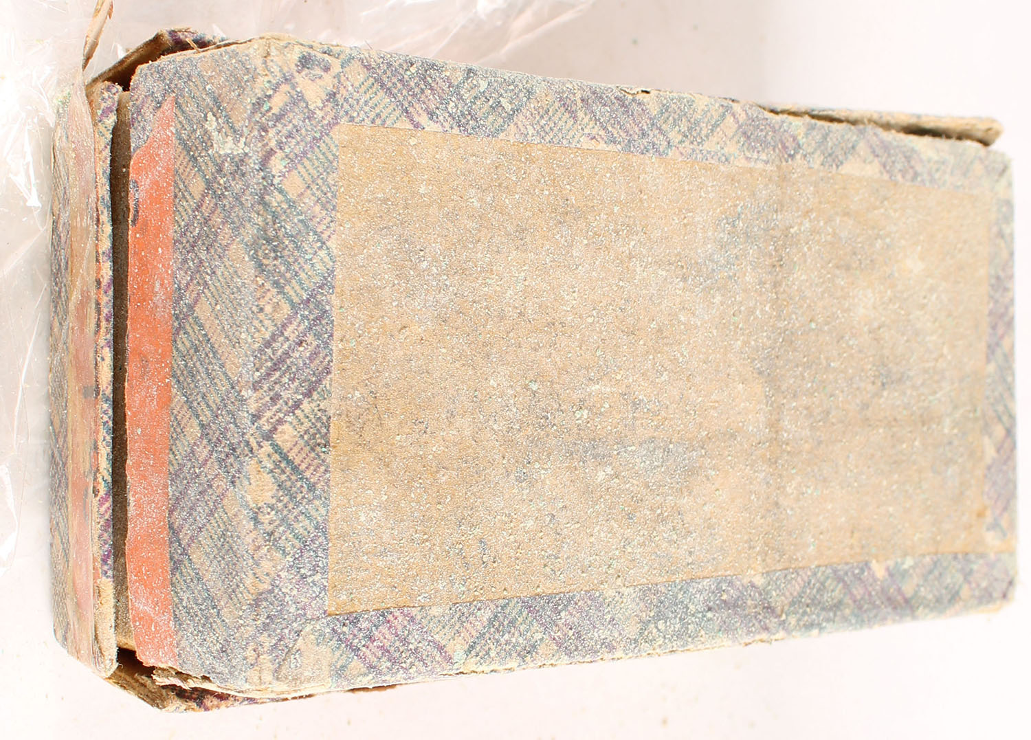 UMC, Rifle Cartridges, .38 Long Rim Fire, Swaged Bullets, Full, 2pc. Purple fabric box with green top & orange side sealing labels, box has several seam splits & partial seam splits, lid is missing left end, poor to fair color, age soiling, shelf wear, edge & corner wear, side sealing label is 99% intact, ammo is poor. Grade: Fair - Value: 20 to 100