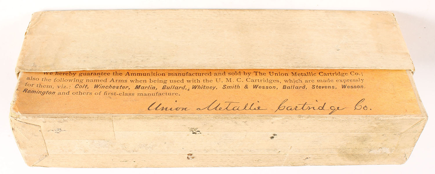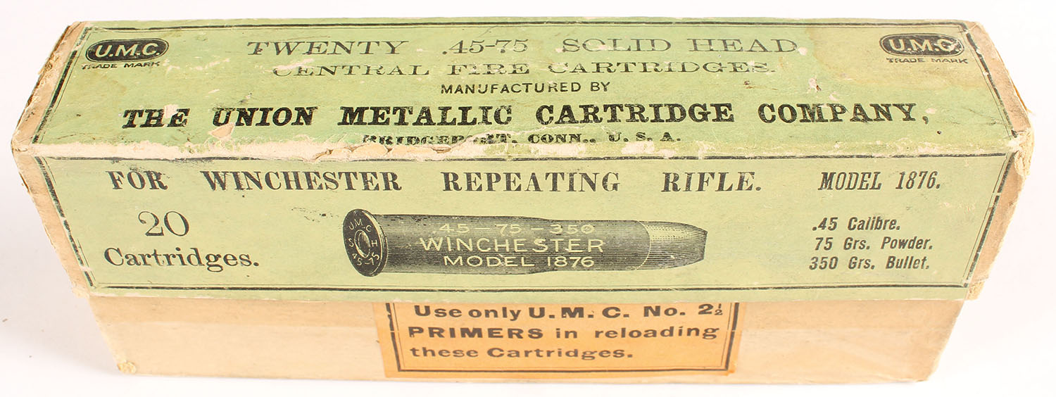 UMC, Central Fire Cartridges, .45-75 Winchester, 350 Grs. Bullet, Full, 2pc. Buff box with green label, box is solid with very good to excellent color, some shelf & edge wear, corner wear, stain on top, seam split to left edge of lid, label is intact, ammo is excellent. Grade: Very Good + - Value: 80 to 240