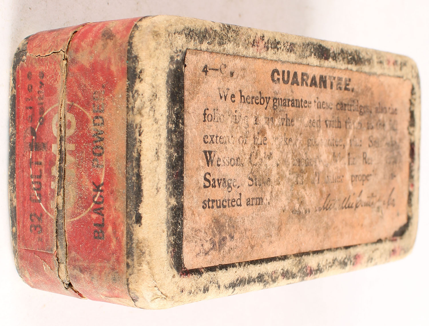 UMC, Central-Fire Cartridges, .32 Colt Police Positive, Black Powder, Full, of mixed H/S, 2pc. Black mottled box with red top & side sealing labels, box is solid with very good color, some age soiling & staining, edge & corner wear, labels are intact, ammo is good. Grade: Good ++ - Value: 8 to 40