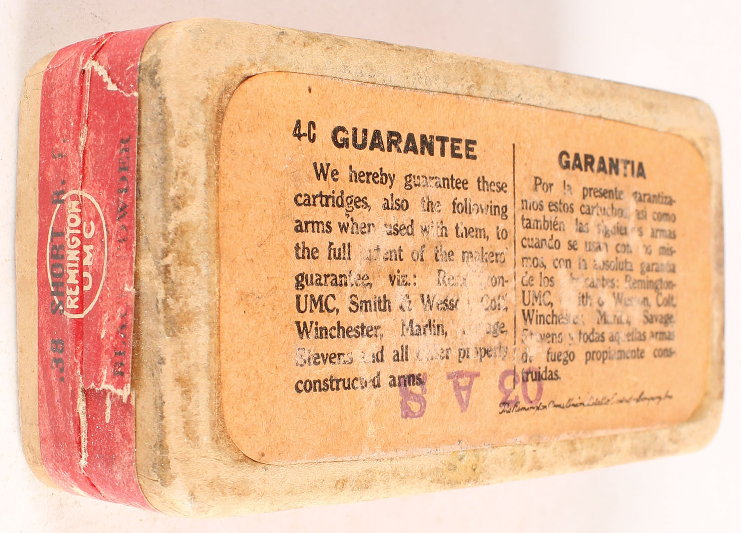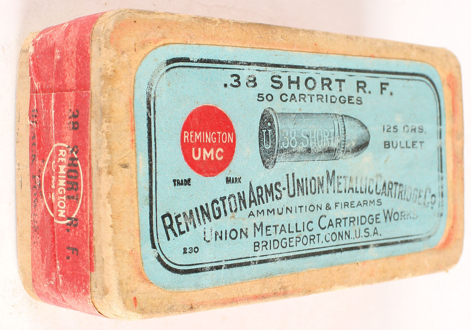 REM-UMC, .38 Short Rim Fire, 125 Grs. Bullet, Black Powder, FULL & SEALED, 2pc. Buff box with blue top & red side sealing labels, box is solid with very good to excellent color, some shelf wear, very minor corner wear, edges are mostly crisp, labels are intact. Grade: Very Good + - Value: 20 to 80