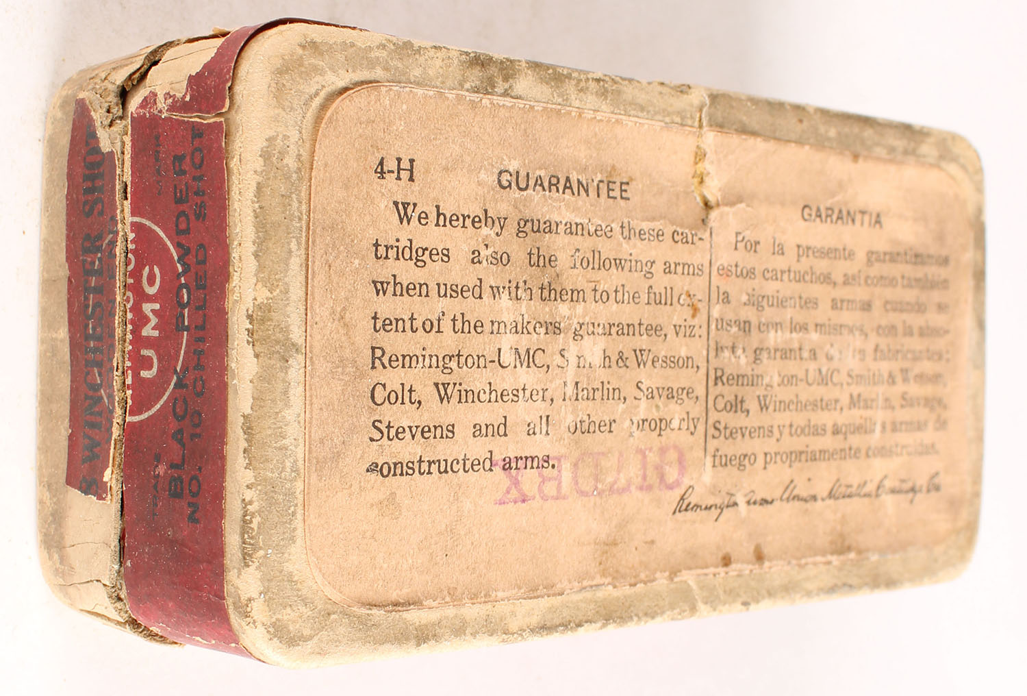 REM-UMC, Central Fire Cartridges, .38 Winchester Shot, No.10 Chilled Shot, Wooden End, Black Powder, Partial 2rds. of mixed REM-UMC H/S, box has repaired tear on back side, good to very good color, age soiling, minor shelf wear, some edge & corner wear, labels are intact, ammo is very good. Grade: Good - Value: 8 to 40