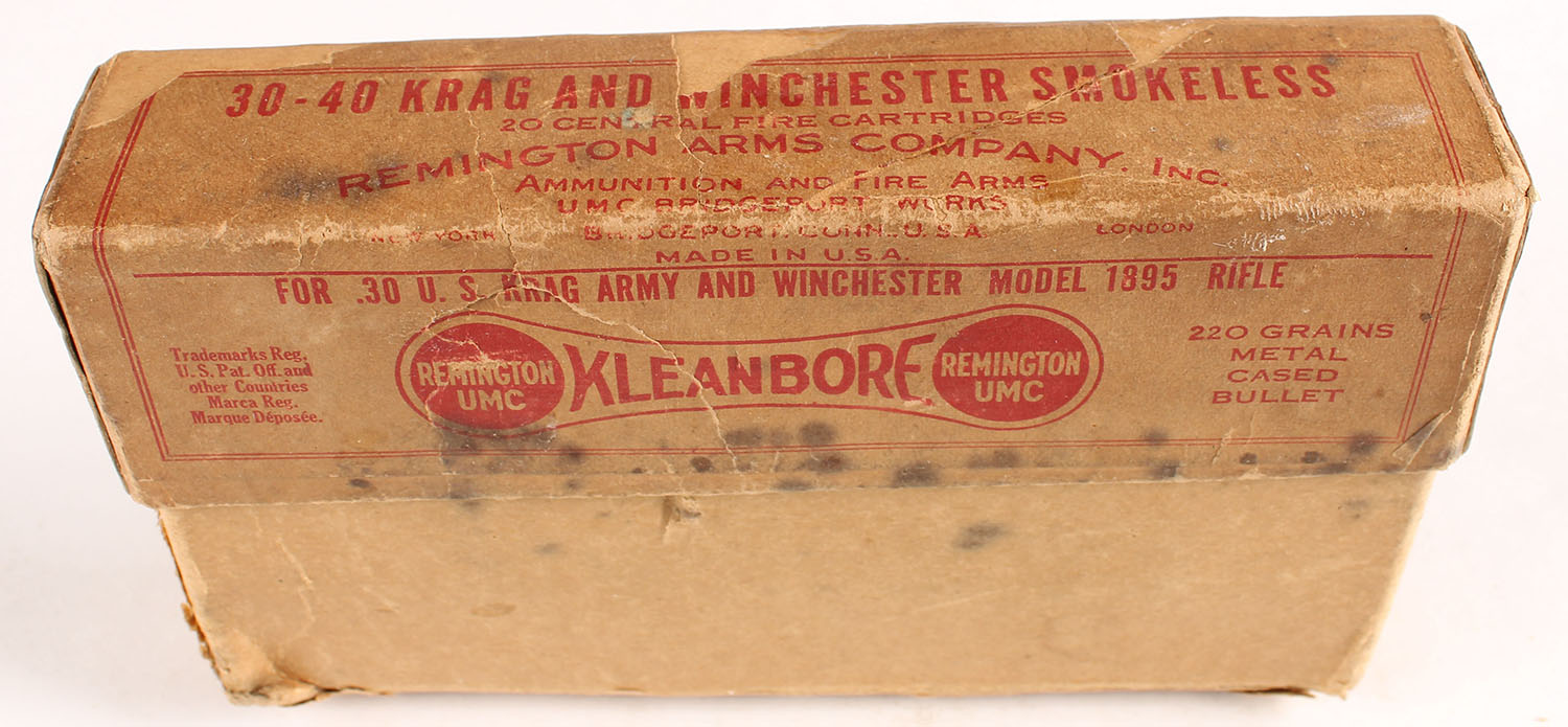 REM-UMC, Kleanbore, .30 Army (.30-40 Krag), 220 Grain Metal Cased Bullet, Full of incorrect ammo, 2pc. Buff box with buff & red label, box is solid with very good color, some age soiling, staining, sticker on back, edge & corner wear, ammo is very good. Grade: Good - Value: 6 to 30