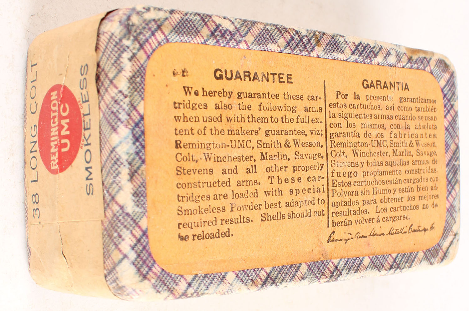 REM-UMC, Central Fire Cartridges, .38 Long Colt, 148 Grs. Bullet, Smokeless, FULL & SEALED, 2pc. Purple fabric box with buff top & side sealing labels, box is solid with excellent color, very minor edge & corner wear, labels are intact. Grade: Excellent + - Value: 40 to 120