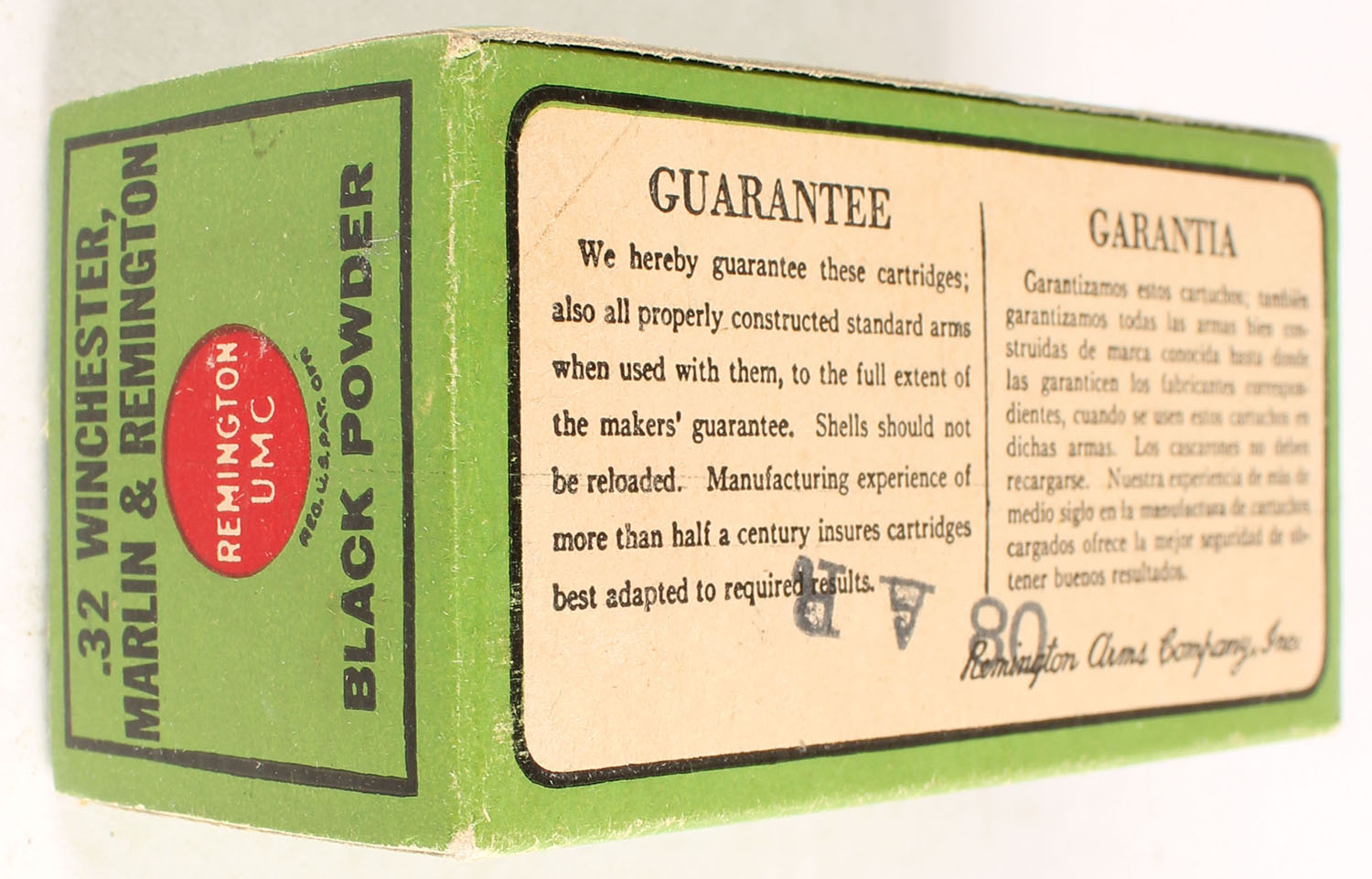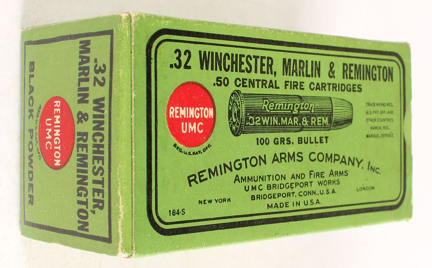 REM-UMC, Central Fire Cartridges, .32 Winchester, 100 Grs. Bullet, Black Powder, Full, 1pc. Green black & red box, box is near mint with minty color, only very minor corner wear, edges are mostly crisp, end flaps are solid, ammo is very good to excellent. Grade: Excellent ++ - Value: 50 to 150
