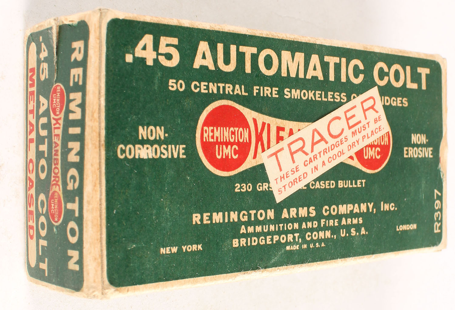 Remington, Kleanbore, .45 Automatic Colt Tracer, 230 Grs. Metal Cased Bullet, Partial 29rds. 1pc. Green buff & red dog bone box with white 'Tracer' over-label, box is solid with excellent color, minor corner wear, edges are mostly crisp, end flaps are solid, ammo is excellent. Grade: Excellent + - Value: 20 to 60
