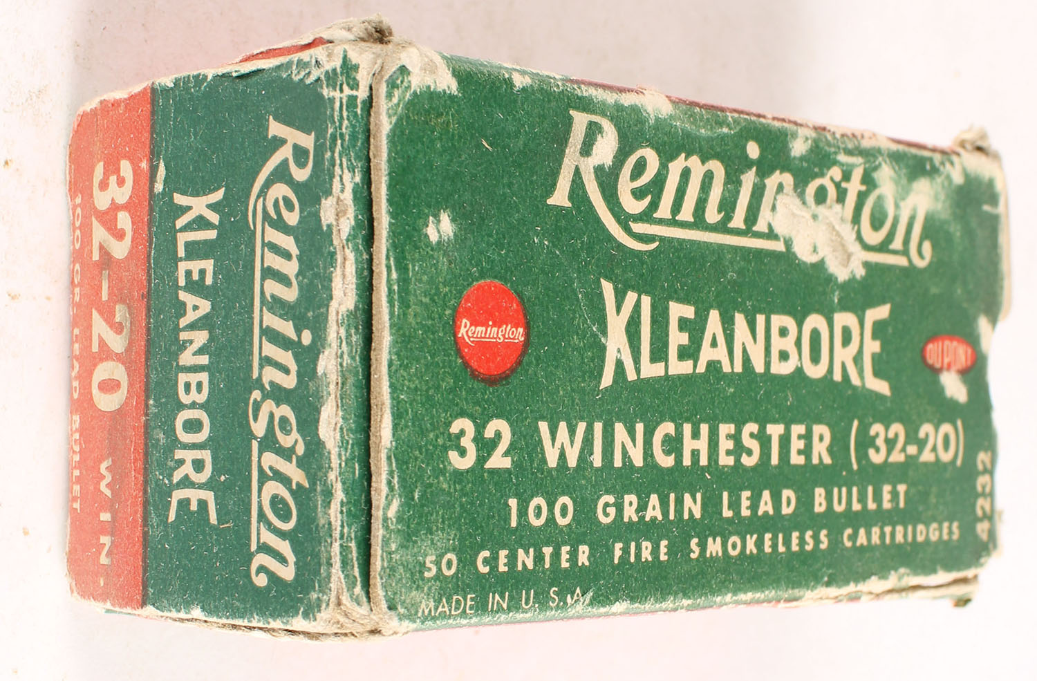 Remington, Kleanbore, .32 Winchester (.32-20), 100 Grain Lead Bullet, Partial 37 rds., 1pc. Green red & white box, missing right end flap, partial seam split to top front edge, edge & corner wear, left end flap is solid, ammo is excellent. Grade: Fair ++ - Value: 20 to 80