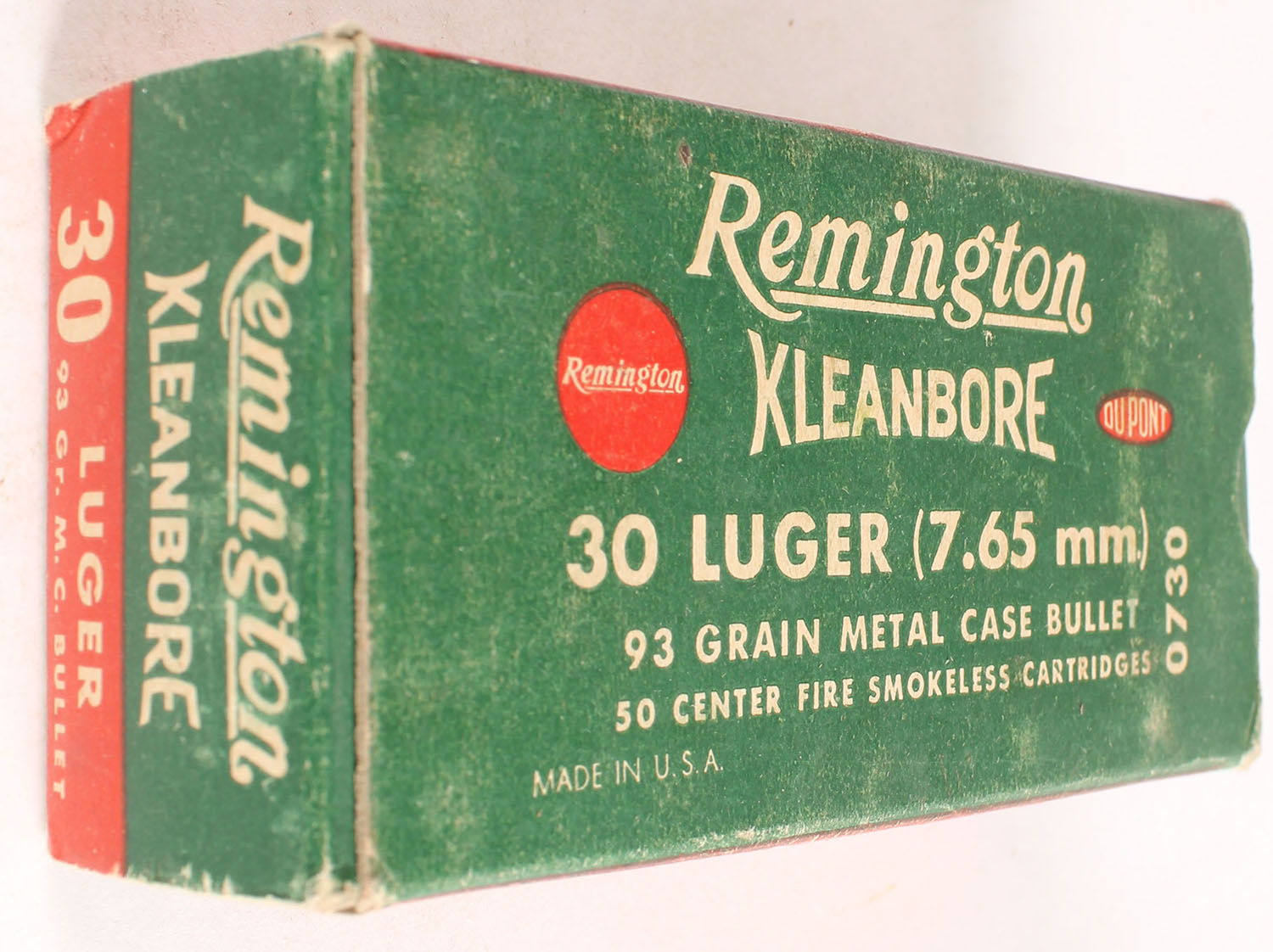 Remington, Kleanbore, .30 Luger (7.65mm), 93 Grain Metal Case Bullet, Full, 1pc. Green buff & red box, box is solid with very good to excellent color, minor age soiling & shelf wear, some corner wear, edges are mostly crisp, end flaps are solid, ammo is excellent. Grade: Excellent - Value: 16 to 60