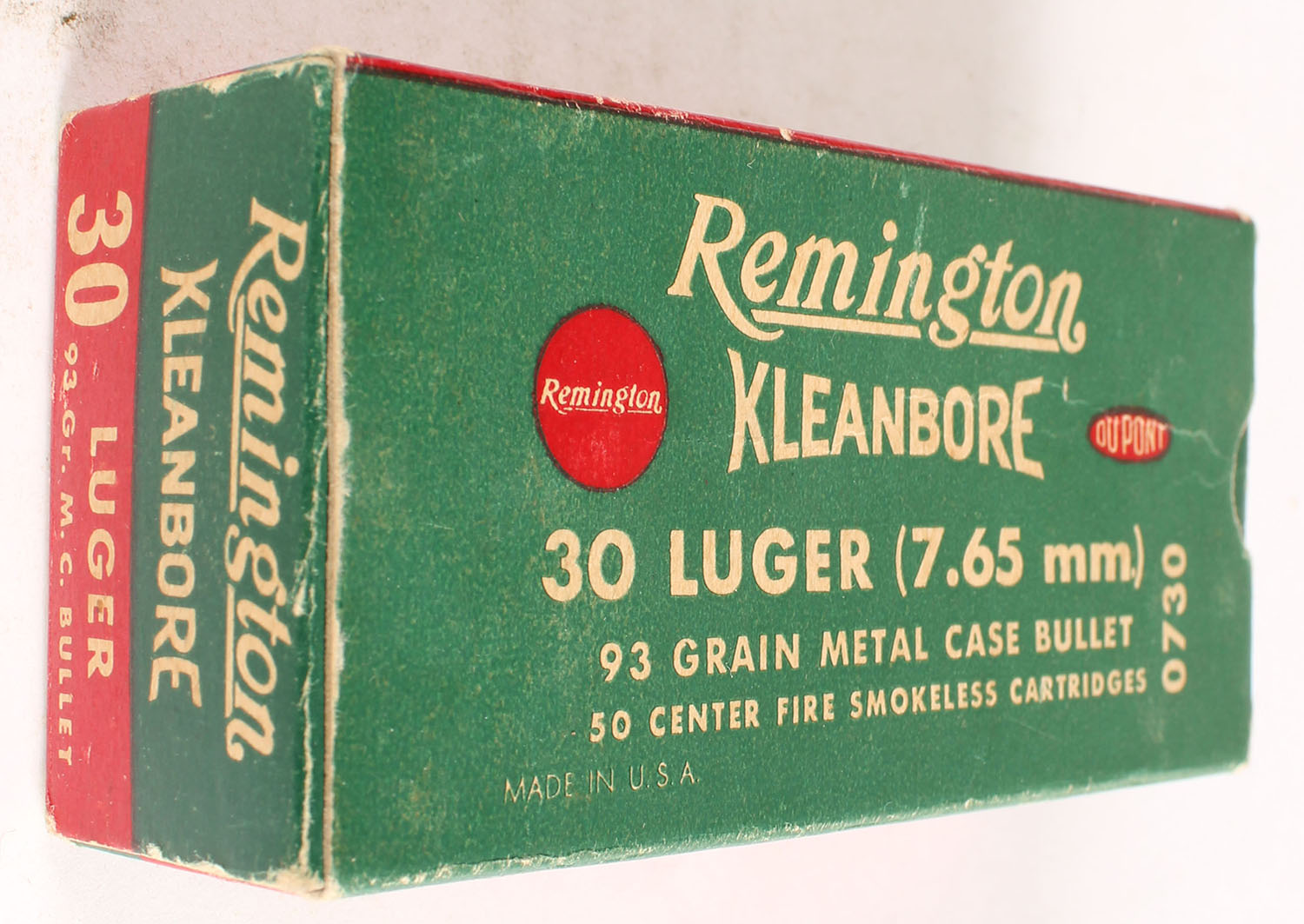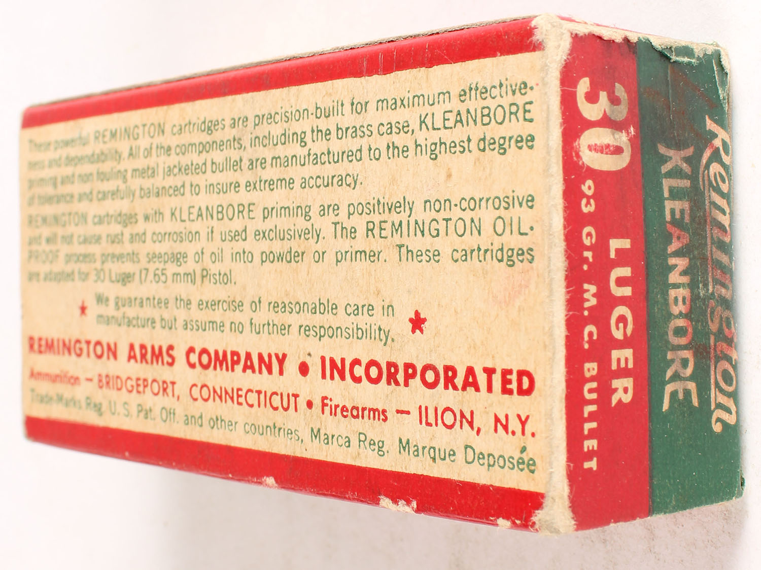 Remington, Kleanbore, .30 Luger (7.65mm), 93 Grain Metal Case Bullet, Partial 18rds., 1pc. Green buff & red box, box is solid with excellent color, very minor age soiling, tape on front, minor corner wear, edges are mostly crisp, end flaps are solid, ammo is excellent. Grade: Very Good ++ - Value: 6 to 30