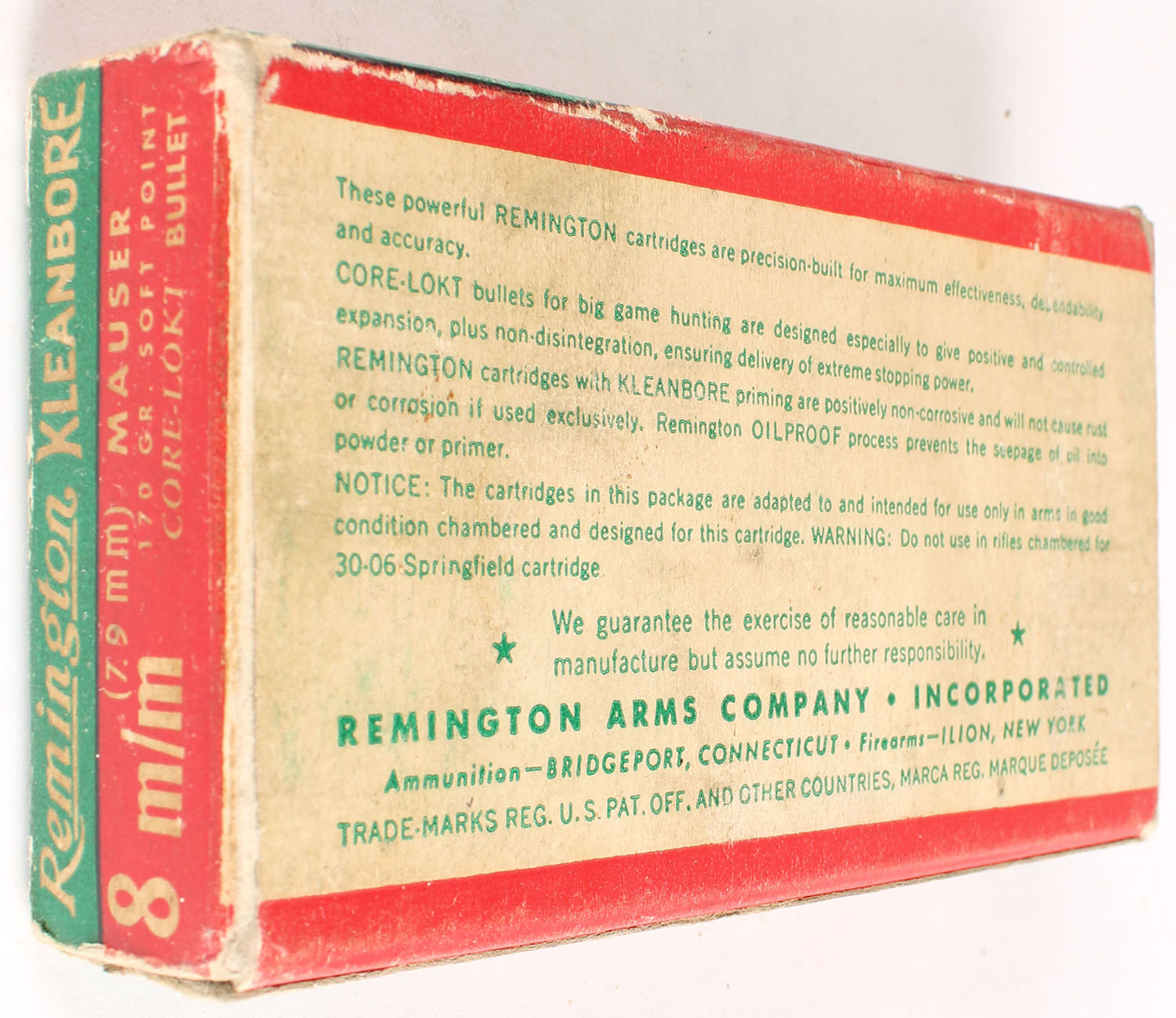 Remington, Kleanbore Hi-Speed, 8mm Mauser, 170 Grain Soft Point Core-Lokt Bullet, Full, 1pc. Green buff & red box, box is solid with very good color, some age soiling & corner wear, very minor edge wear, end flaps are solid, ammo is very good. Grade: Very Good ++ - Value: 10 to 40