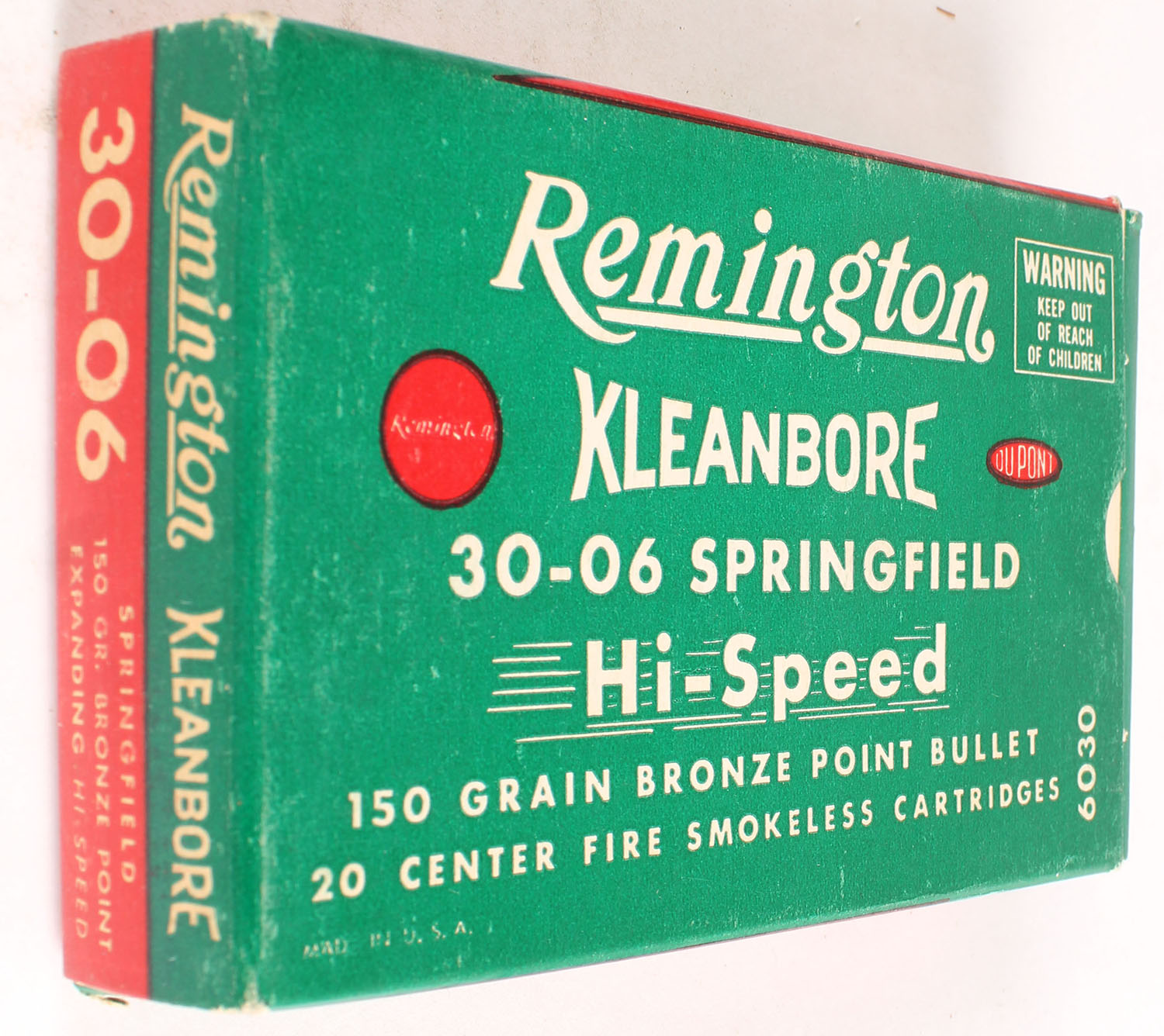 Remington, Kleanbore Hi-Speed, .30-06 Springfield, 150 Grain Bronze Point Bullet, Full, 1pc. Green white & red box, box is solid with excellent color, minor corner wear, edges are crisp, end flaps are solid, ammo is excellent. Grade: Excellent + - Value: 10 to 40