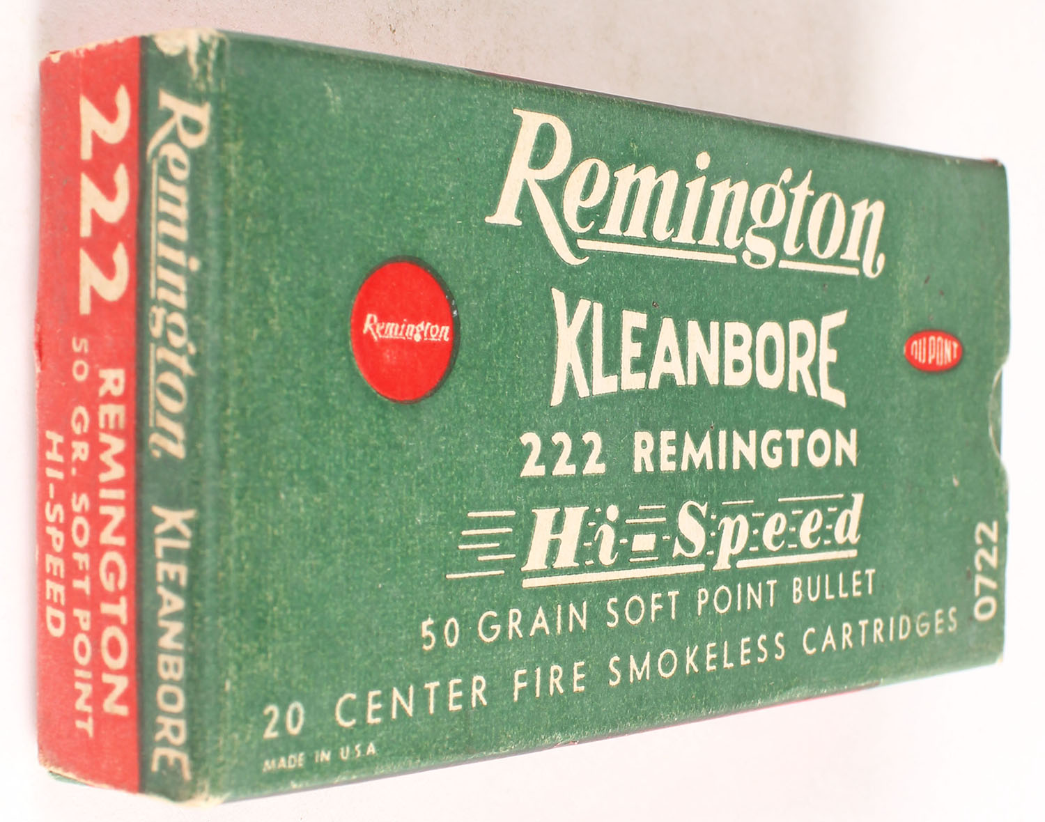 Remington, Kleanbore Hi-Speed, .222 Remington, 50 Grain Soft Point Bullet, Full, 1pc. Green white & red box, box is solid with excellent color, minor shelf & corner wear, edges are crisp, end flaps are solid, ammo is excellent. Grade: Excellent - Value: 10 to 40