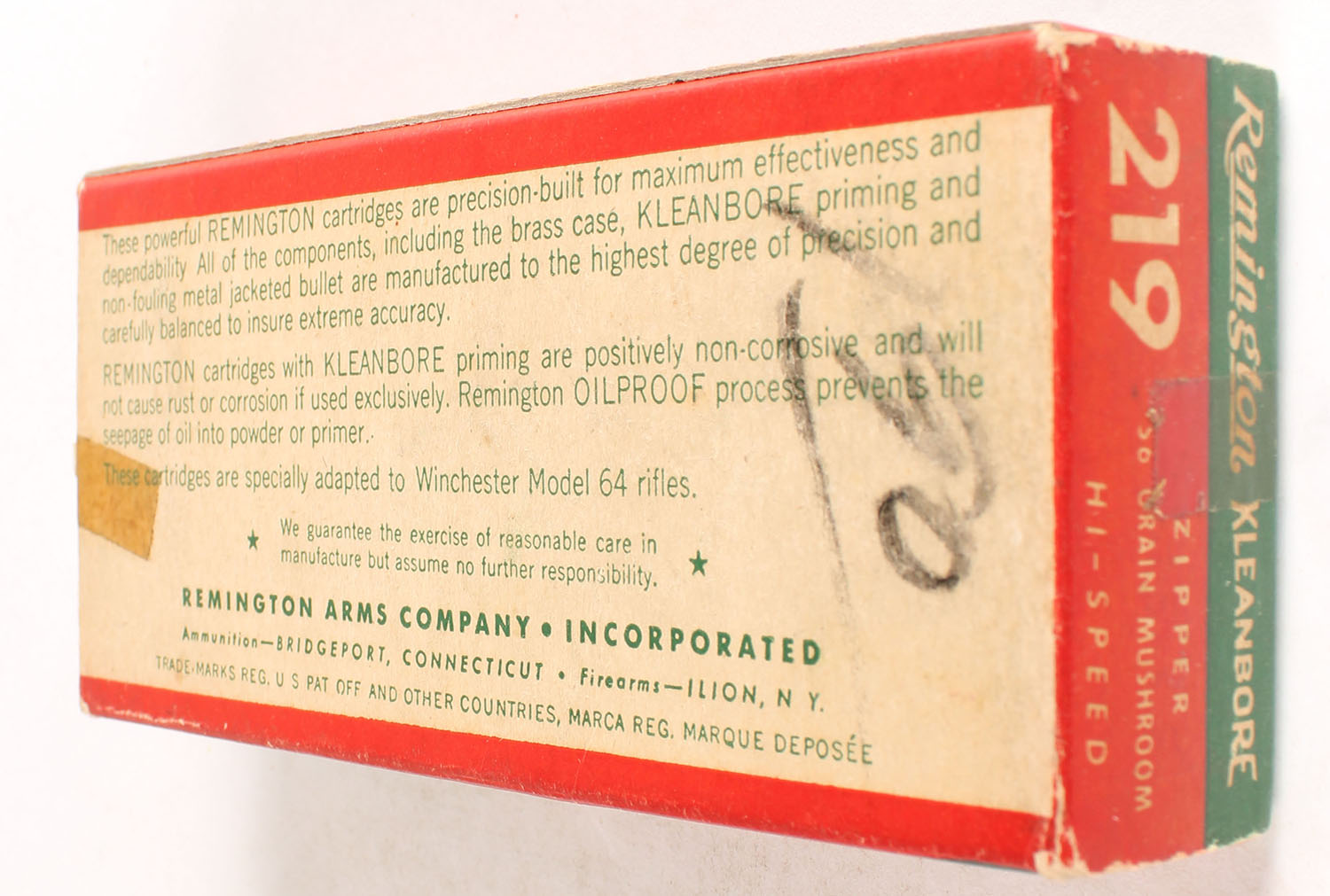 Remington, Kleanbore Hi-Speed, .219 Zipper, 56 Gr. Mushroom Bullet, Full, 1pc. Green buff & red box, box is solid with excellent color, minor age soiling & corner wear, edges are crisp, tape on both ends, end flaps are solid, ammo is excellent. Grade: Excellent - Value: 70 to 210