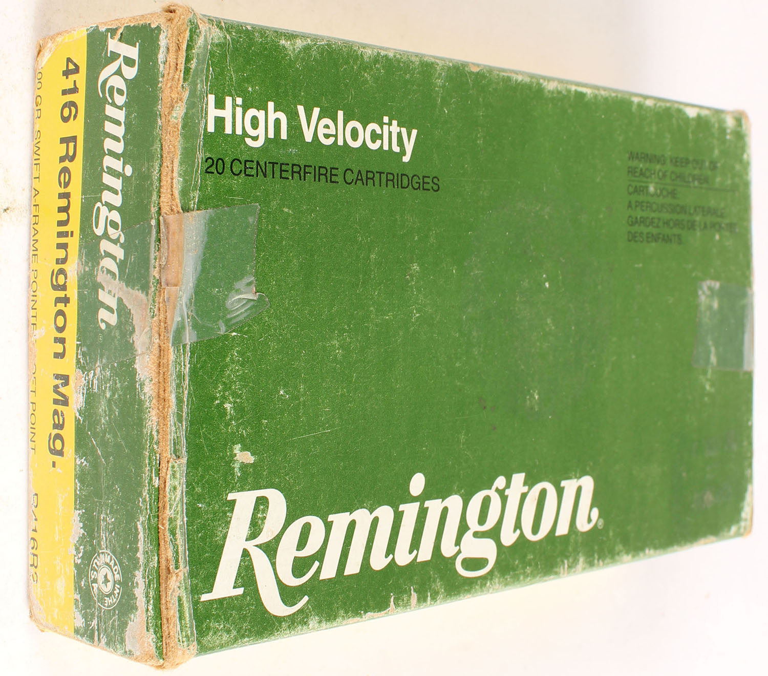 Remington, High Velocity, .416 Remington Magnum, 400 Grain Swift A-Frame Pointed Soft Point, Full, 1pc. Green & yellow box, box is solid with excellent color, shelf & corner wear, ammo is excellent. Grade: Very Good ++ - Value: 30 to 90