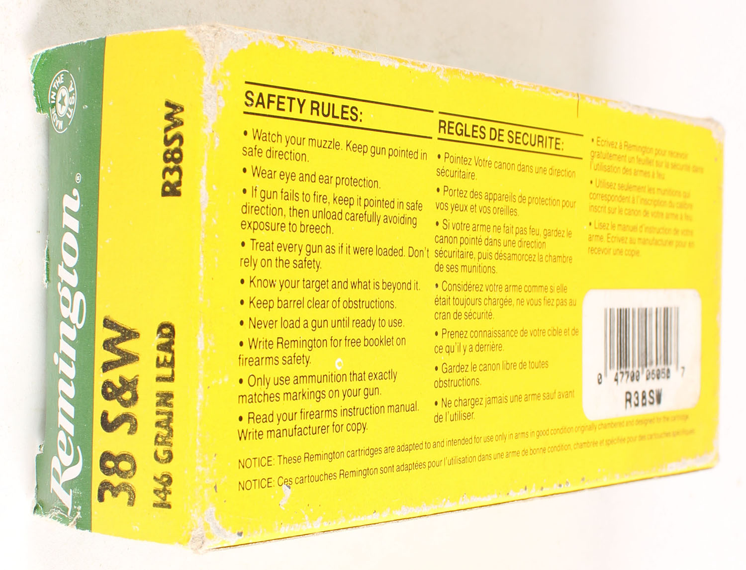 Remington, High Velocity, .38 Smith & Wesson, 146 Grain Lead, Full, 1pc. Green yellow & white box, box is solid with very good color, has shelf & corner wear, very minor edge wear, end flaps are solid, ammo is excellent. Grade: Excellent - Value: 20 to 60