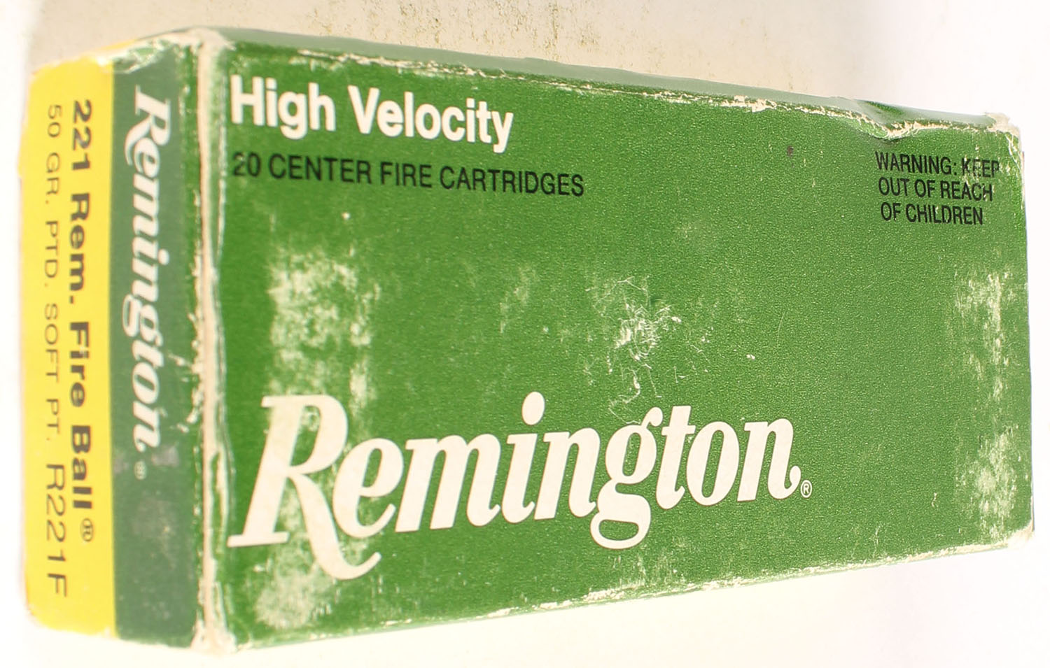 Remington, High Velocity, 221 Rem Fire Ball, 50 Grain Pointed Soft Point, Full, 1pc. Yellow, green, white & black box, box has rub marks with edge & corner wear, end flaps are solid, ammo is excellent. Grade: Very Good ++ - Value: 10 to 50