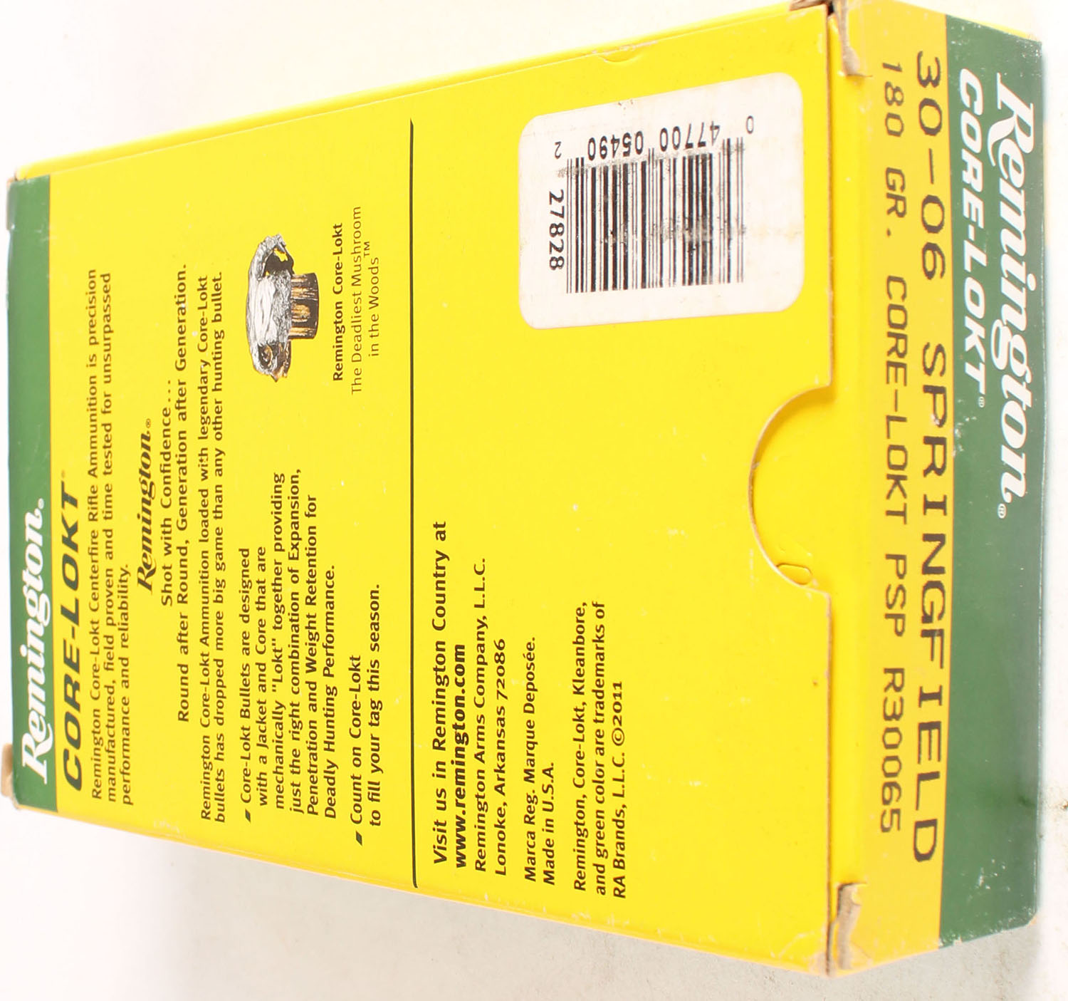 Remington, Core-Lokt, .30-06 Springfield, 180 Gr. Core-Lokt PSP, Full, 1pc. Green yellow & white box, box is very solid with excellent color, end flaps are solid, sticker on top, ammo is excellent. Grade: Excellent + - Value: 20 to 60