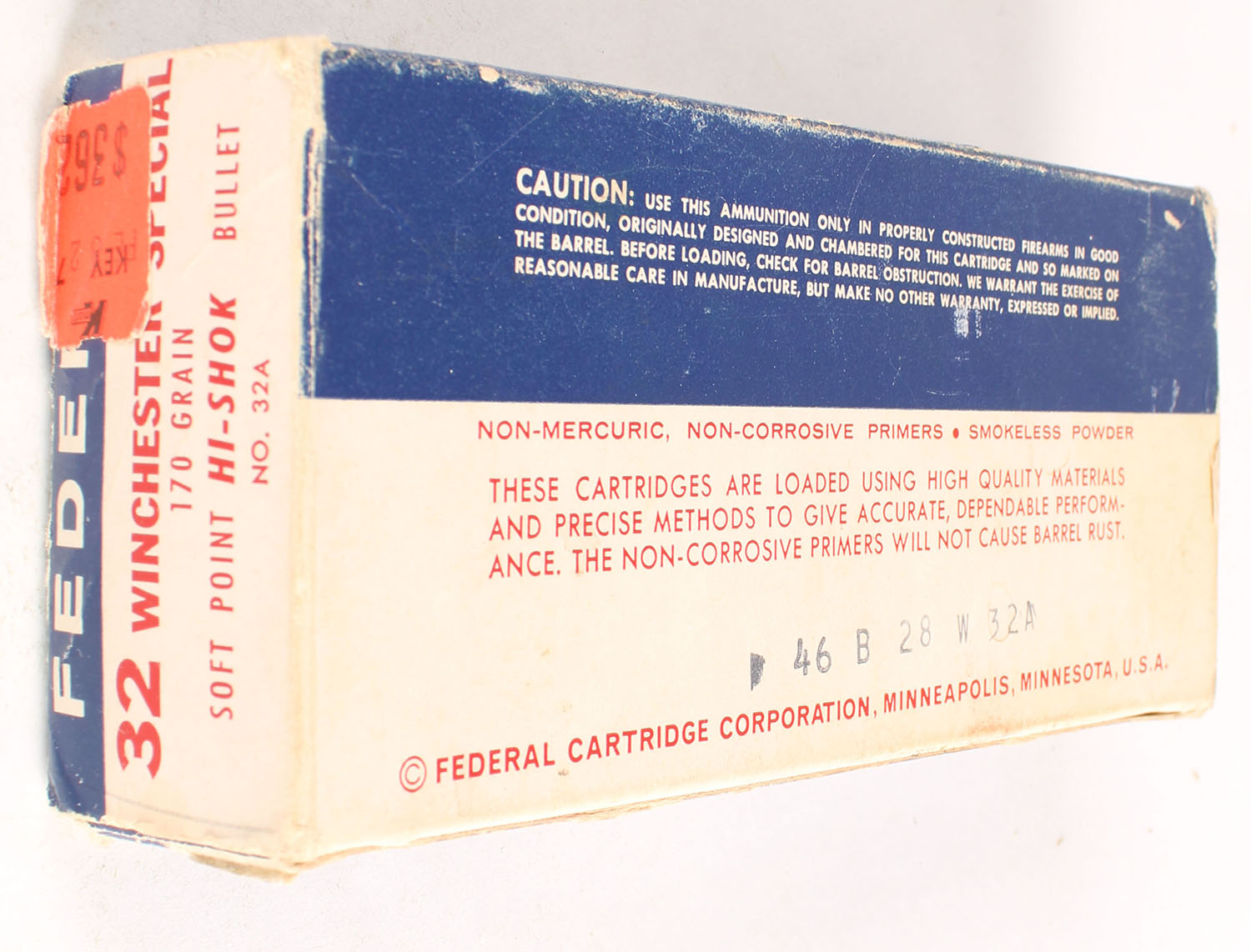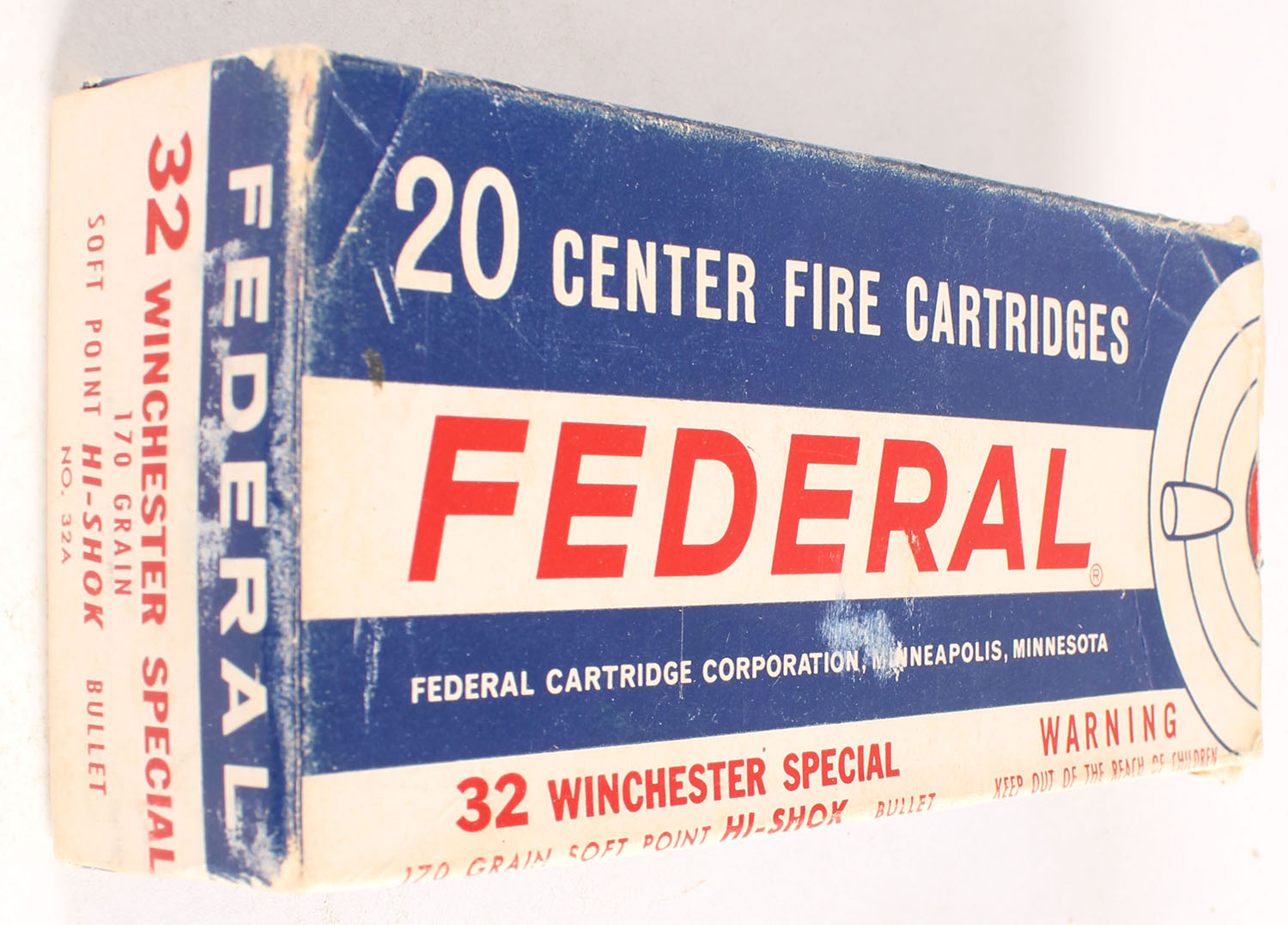 Federal, 32 Winchester Special, 170 Gr. S.P. Hi-Shok Bullet, 1 pc., Full of mixed H.S., box shows wear, end flaps are solid, ammo is very good. Grade: Very Good - Value: 10 to 40