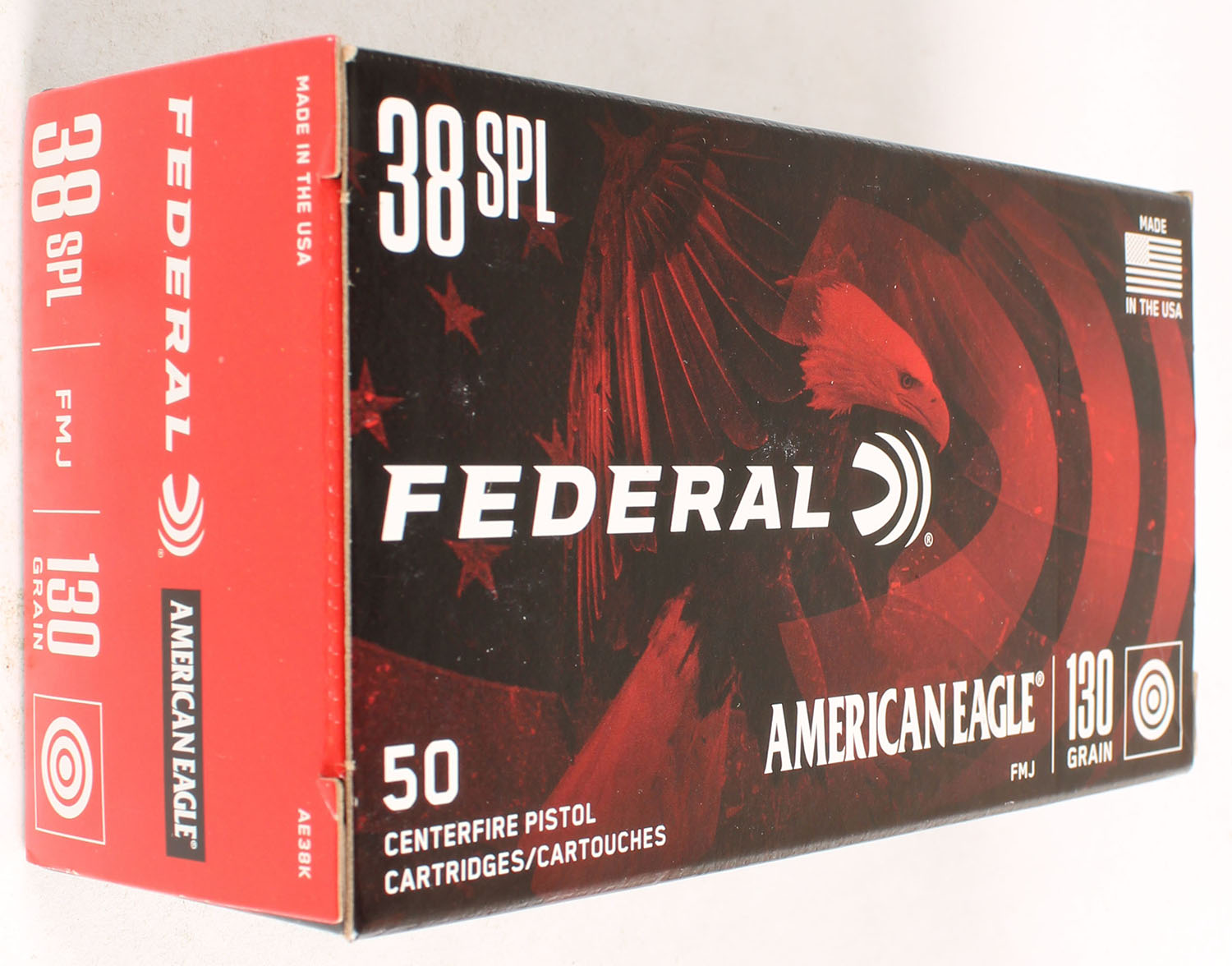 Federal, American Eagle, 38 SPL, 130 Grain FMJ, Full, 1pc., multi-colored box, box is solid with great color, end flaps are solid, ammo is excellent. Grade: Excellent ++ - Value: 10 to 50