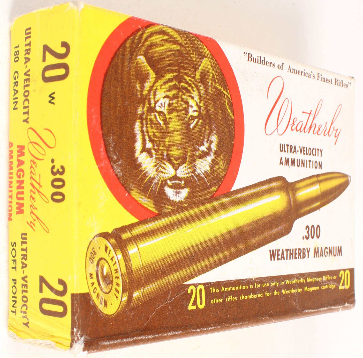 Weatherby, 300 W.M., 180 Grain Soft Point, Full, 1pc., multi-colored box, box is solid with great color, has some scuffing, end flaps are solid, ammo is very good. Grade: Excellent - Value: 20 to 80