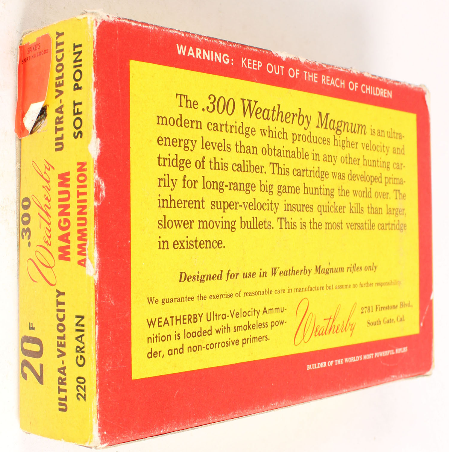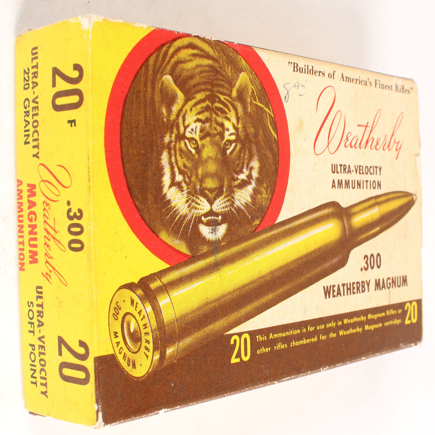 Weatherby, 300 W.M., 220 Grain Ultra-Velocity Soft Point, Full of Reloads, 1pc. multi-colored box, box is solid with excellent color, Ammo is very good. Grade: Very Good ++ - Value: 10 to 40