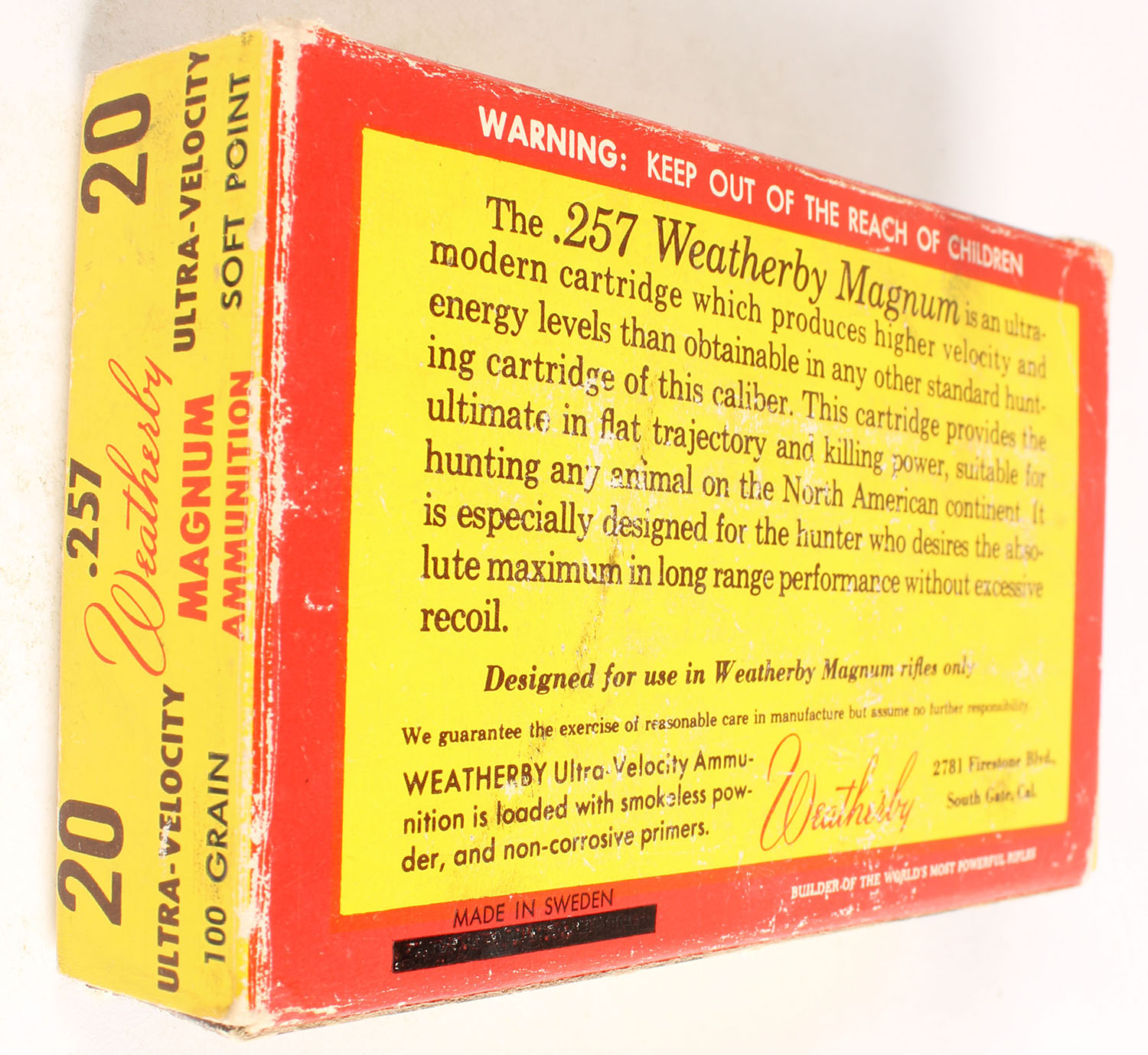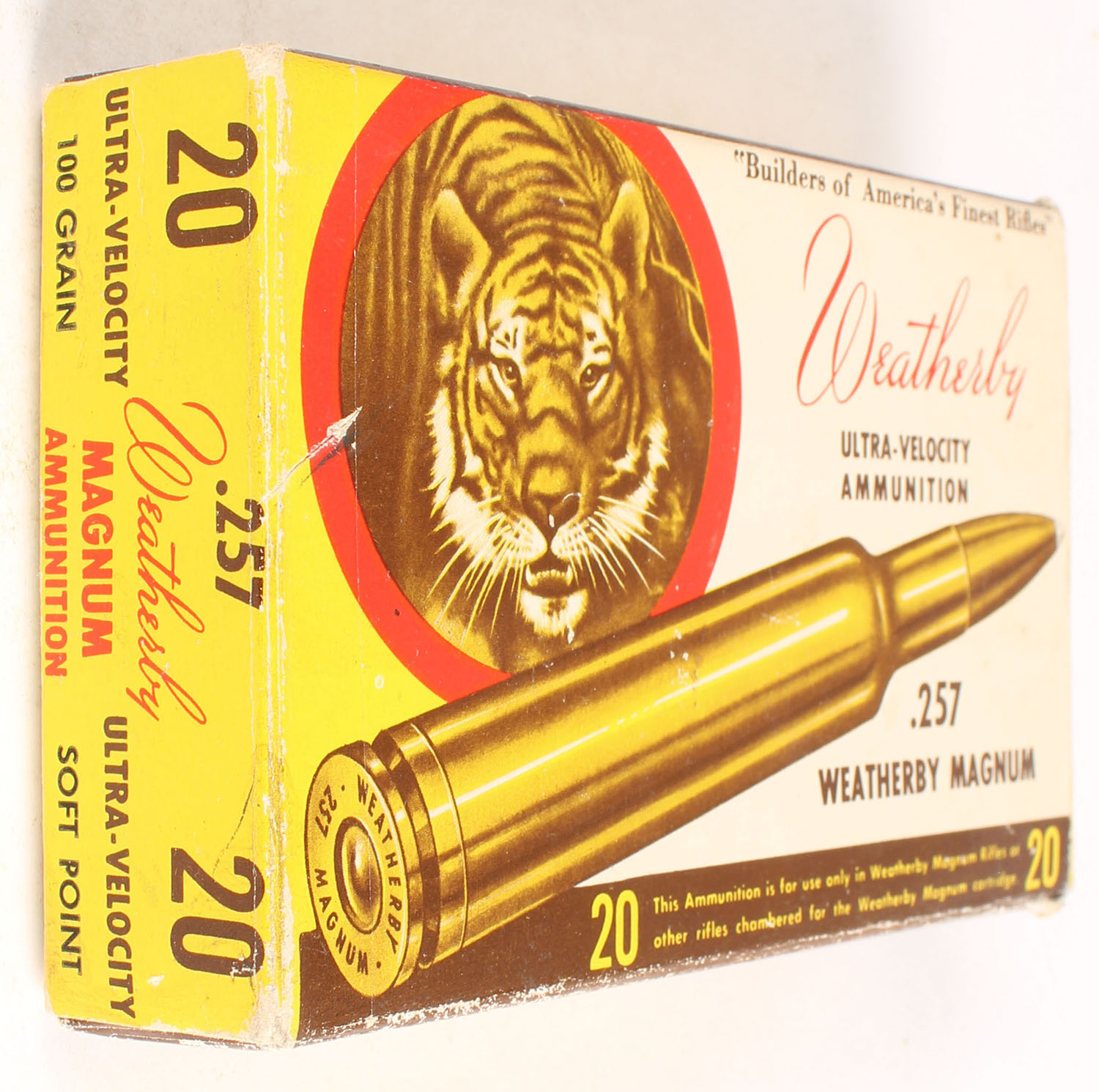 Weatherby, 257 W.M., 100 Grain Ultra Velocity Soft Point, Full, 1pc., multi-colored box, box is solid with very good color, box has some shelf wear, end flaps are solid, ammo is excellent. Grade: Very Good ++ - Value: 20 to 80