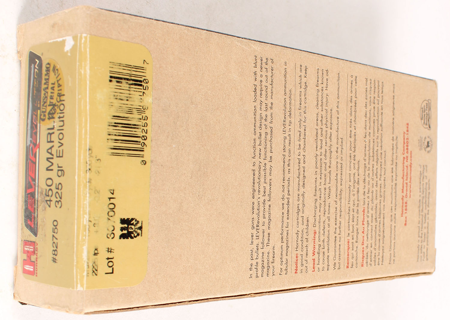 Hornady, LeverEvolution, 450 Marlin, 325 Grain Evolution, Full, 1pc. multi-colored box, box is solid with excellent color, Ammo is excellent. Grade: Excellent ++ - Value: 50 to 150