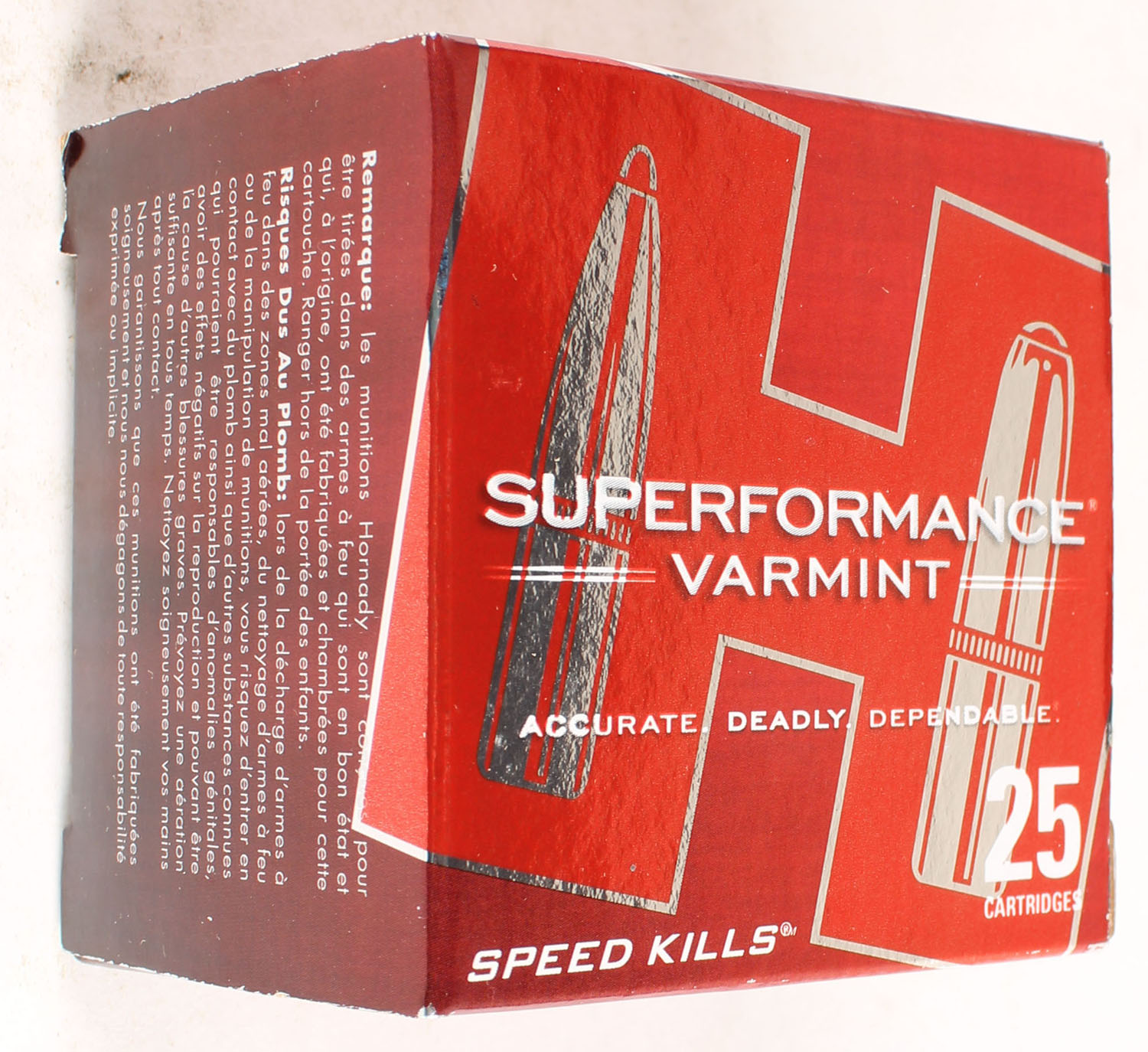 Hornady, Superformance, .17 Hornet, 20 Grain V-Max, Partial 23rds., 1pc. multi-colored box, box is solid with excellent color, Ammo is excellent. Grade: Excellent - Value: 10 to 30