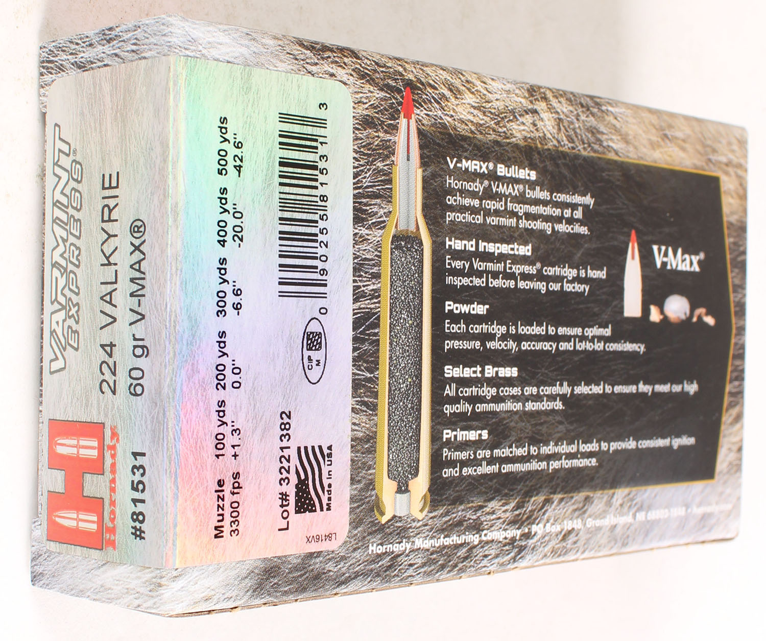 Hornady, Varmint Express, 224 Valkyrie, 60 Grain V-Max, Full, 1pc. multi-colored box, box is solid with excellent color, Ammo is excellent. Grade: MINT - Value: 16 to 50