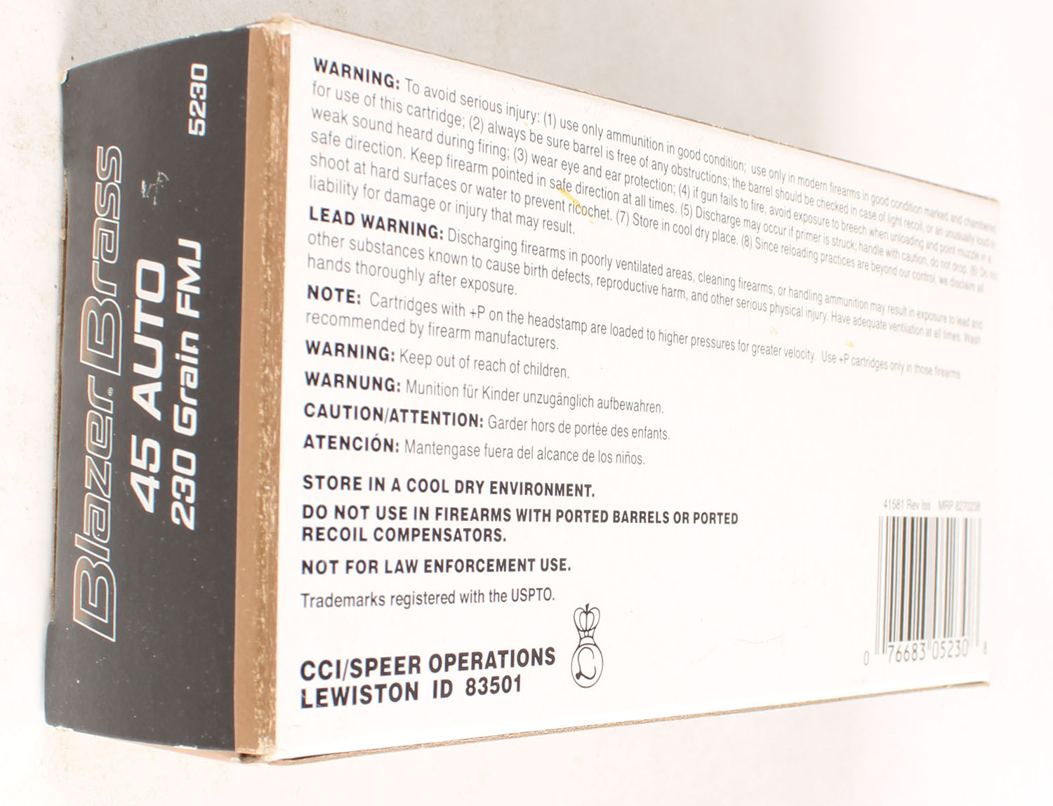 CCI, Blazer Brass, 45 Auto, 230 Grain FMJ, Full, 1pc. multi-colored box, box is solid with excellent color, Ammo is very good. Grade: Excellent - Value: 20 to 50