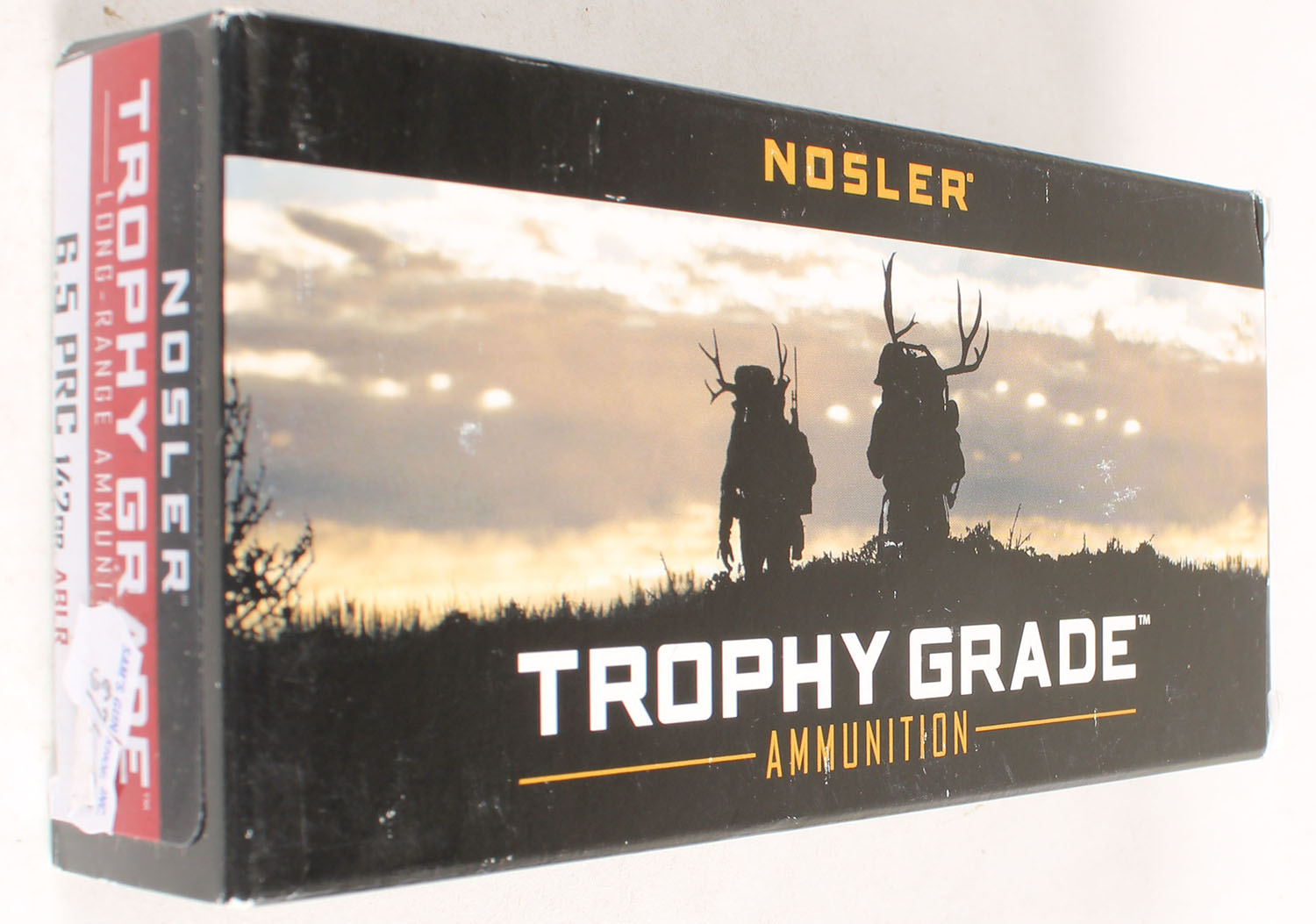 Nosler, Trophy Grade, 6.5 PRC, 142 Grain ABLR, Full, 1pc. multi-colored box, box is solid with excellent color, Ammo is excellent. Grade: Excellent + - Value: 20 to 80