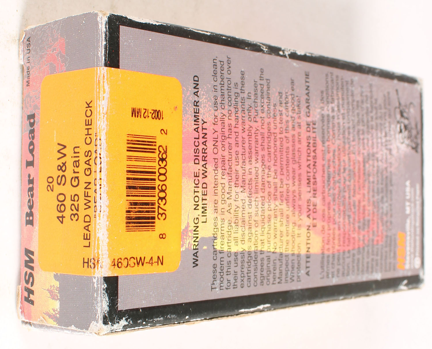 HSM, BEAR LOADS, 460 S&W, 325 Grain LEAD WFN Gas check ''Bear Load'', Full, 1pc., multi-colored box, box has age soiling, Ammo is very good. Grade: Very Good + - Value: 20 to 40