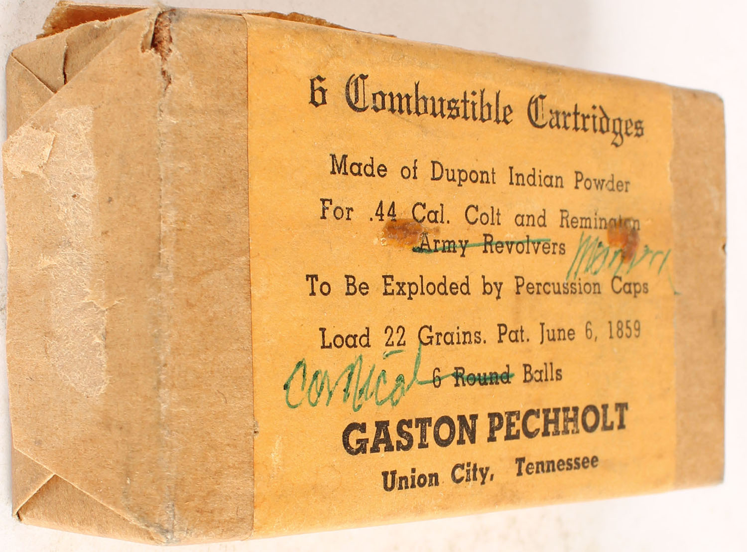 Combustible Cartridges, .44 Cal, 22 Gr. Made of Indian DuPont Powder, Full, 1pc. Paper Box is solid. Grade: Very Good - Value: 8 to 30