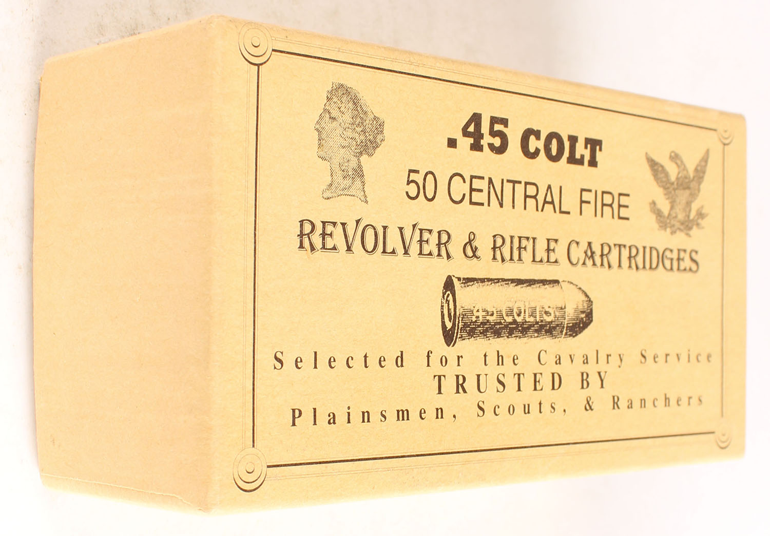 Georgia Arms, 45 Long Colt, 240 Gr. Round Nose Flat Point, Full, 2pc., Buff box with excellent label, box is very solid, ammo is minty. Grade: Excellent ++ - Value: 20 to 80