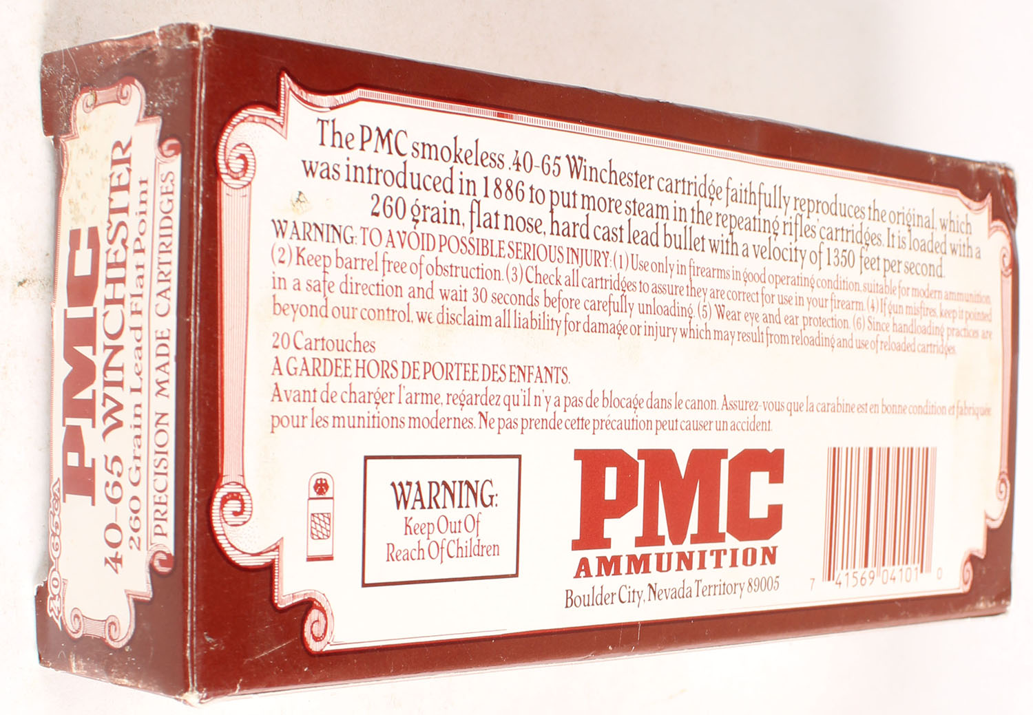 PMC, 40-65 Winchester, 260 Grain Lead Flat Point, 1pc, Full, multi-colored box, box is very solid, ammo is very good. Grade: Very Good ++ - Value: 20 to 80