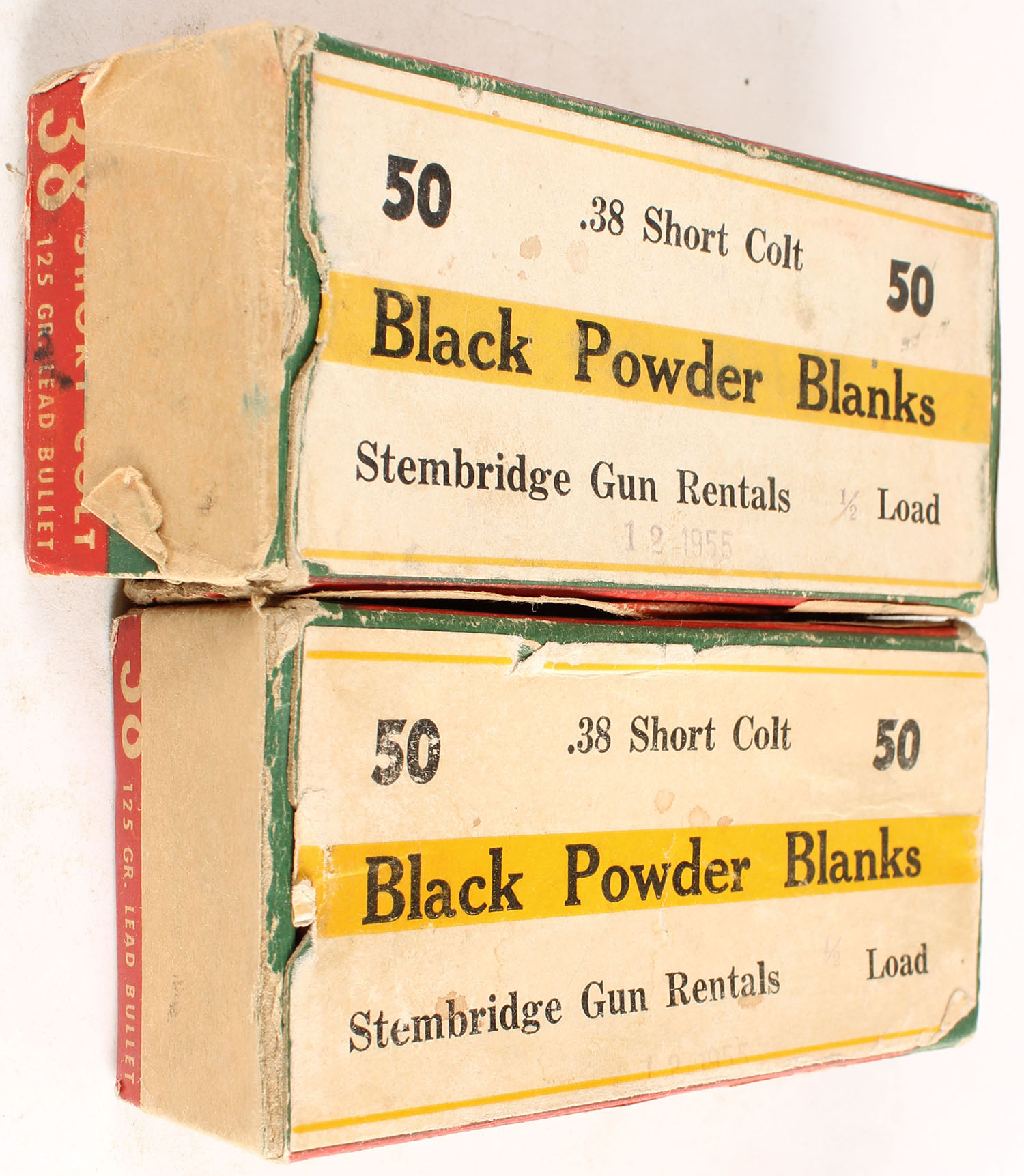Stembridge Gun Rentals Inc., Lot of 2, .38 Short Colt, Black Powder Blanks from the famous Hollywood gun rental company, Appear Partial, 2pc., multi-colored boxes, boxes have scuffing, ammo is good. Grade: Very Good - Value: 20 to 50