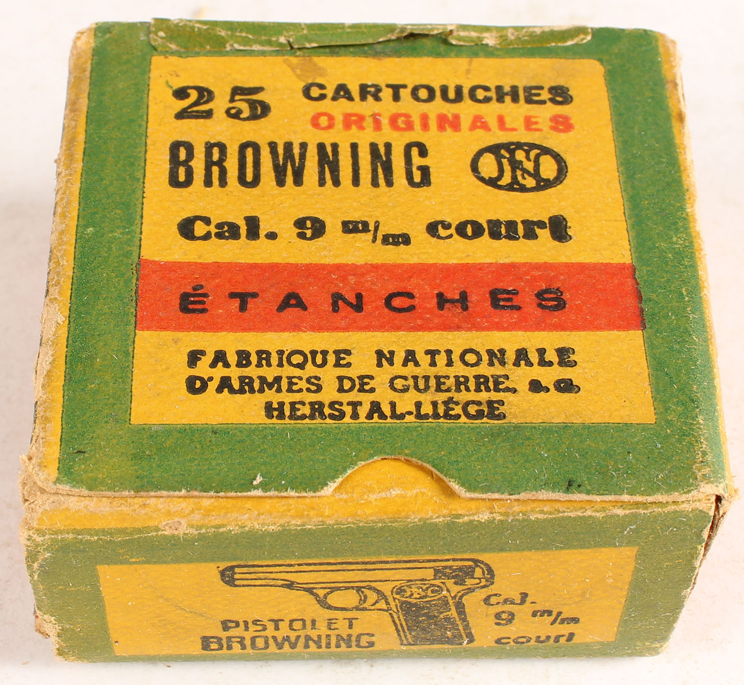 Fabrique Nationale, 9mm, Full, 1pc, multi-colored box, box is solid, has light scuffing with edge wear, ammo is very good. Grade: Very Good - Value: 20 to 100