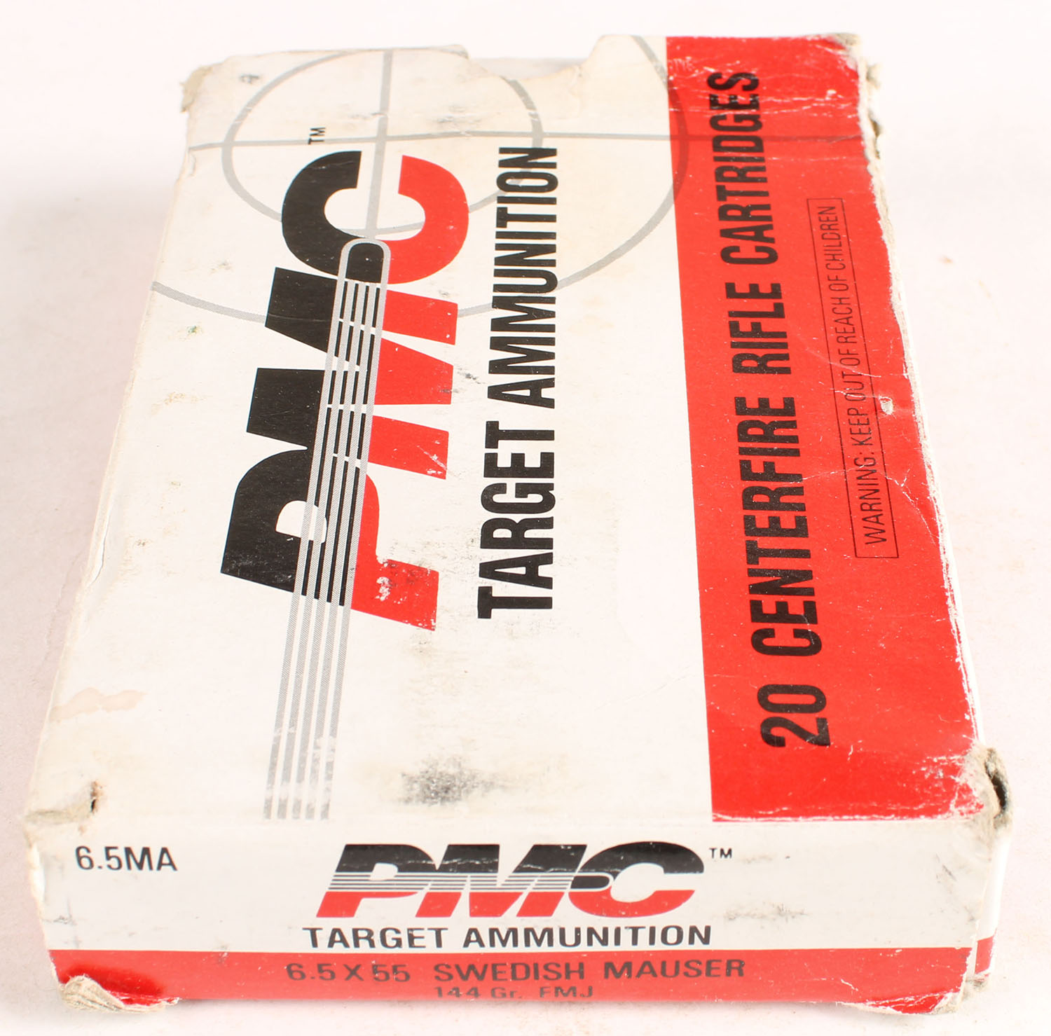 PMC, 6.5x55 Swedish Mauser, 144 Gr. FMJ, 1pc, Full with 14rds being correct, white & red box with black print, box has wear & soiling, ammo is good. Grade: Good ++ - Value: 10 to 30