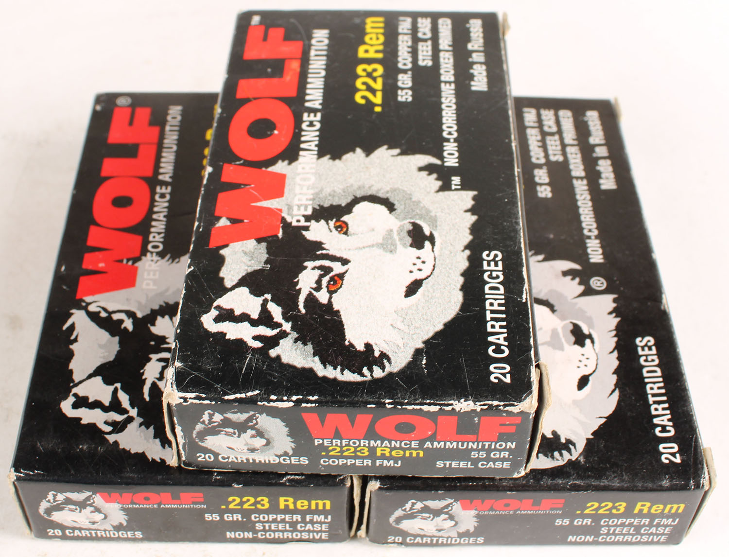 Lot of 3 Wolf, .223 Rem, 55 Grain Copper FMJ, Full, 1pc., Multi-colored boxes, boxes have corner wear, Ammo is excellent. Grade: Very Good ++ - Value: 20 to 50
