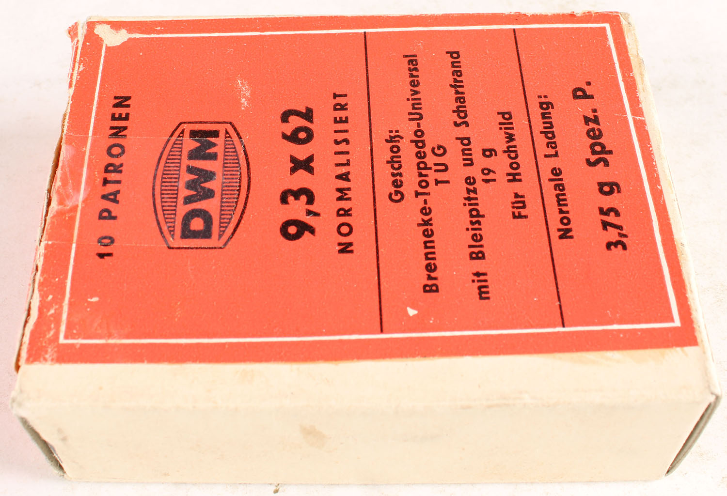DWM, 9.3 x 62, Full, 1pc. Multi-colored box, box has light edge wear, Ammo is excellent. Grade: Very Good ++ - Value: 10 to 40