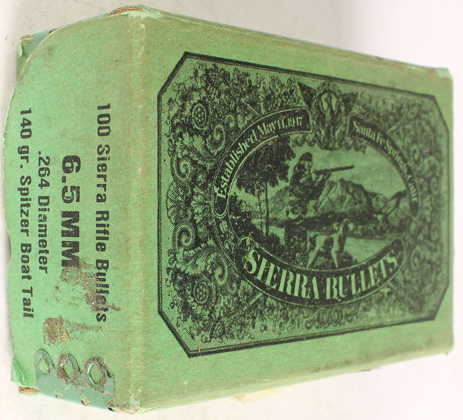 Sierra, 6.5mm, 140 Grain Spitzer Boat Tail, .264 Diameter, Full, 1pc. Green & black box, box is solid with excellent color, minor age soiling. Grade: Excellent - Value: 10 to 40