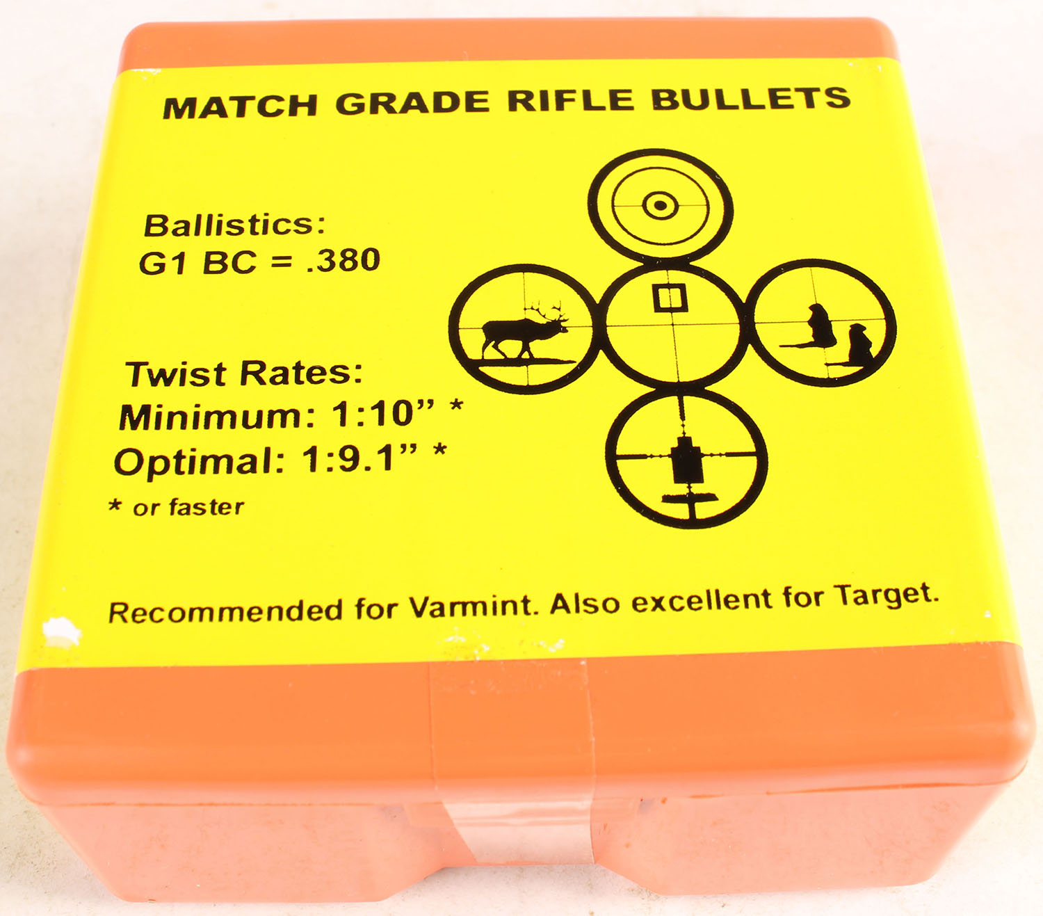 Berger, Match Grade Rifle Bullets, 6mm, 88 GR. High BC FB Varmint, FULL & SEALED, 1pc. Orange plastic box, box is MINT with minty color. Grade: MINT - Value: 10 to 40