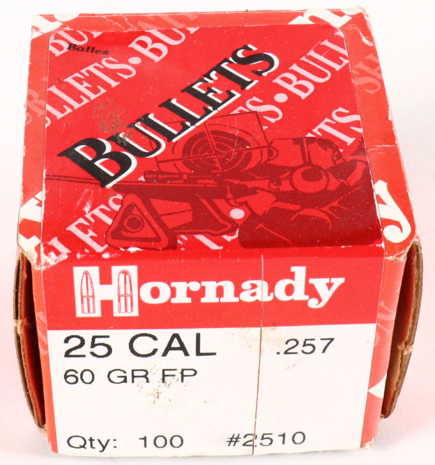 Hornady, .25 Cal., 60 Grain FP, .257, Appears Full, 1pc. Red & white box, box is solid with good color, bullets are minty. Grade: Very Good ++ - Value: 10 to 40