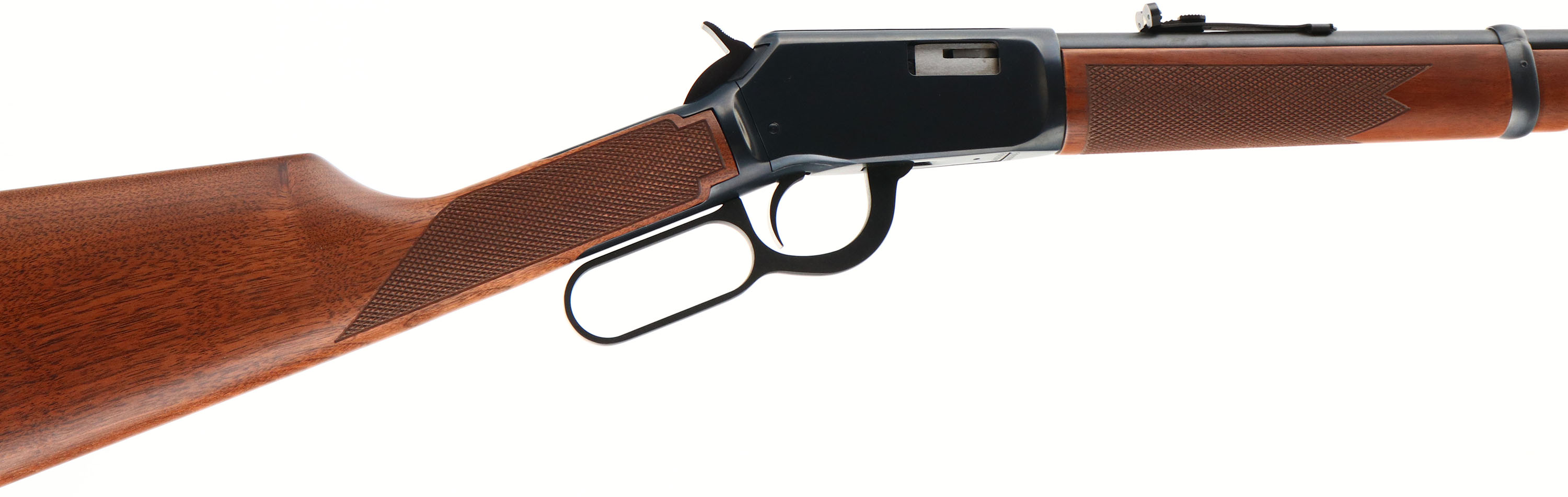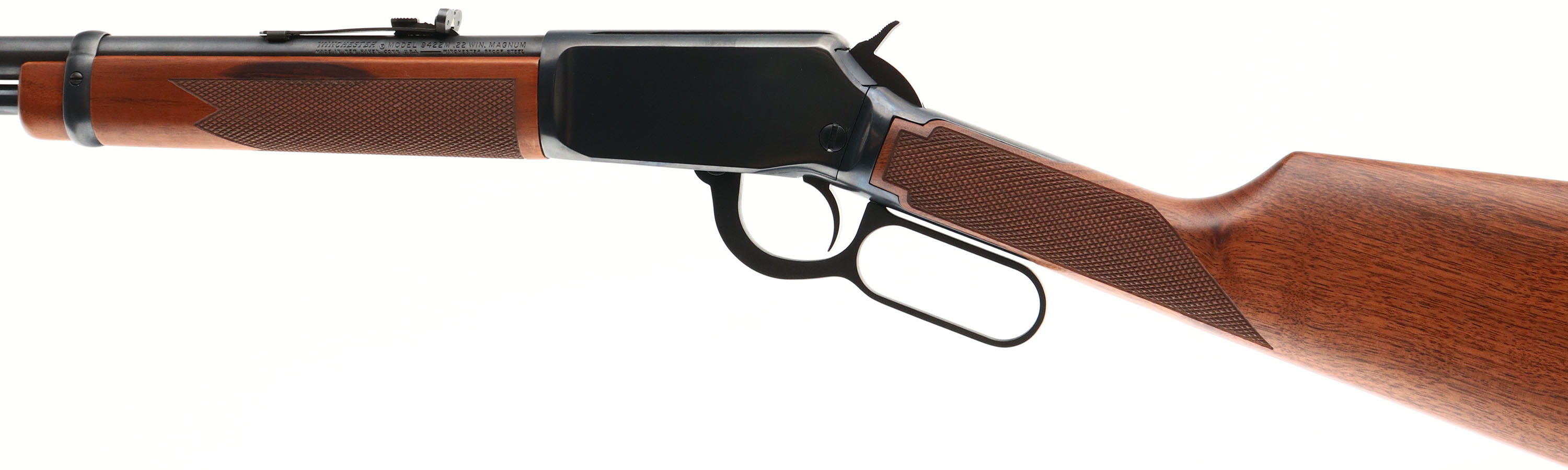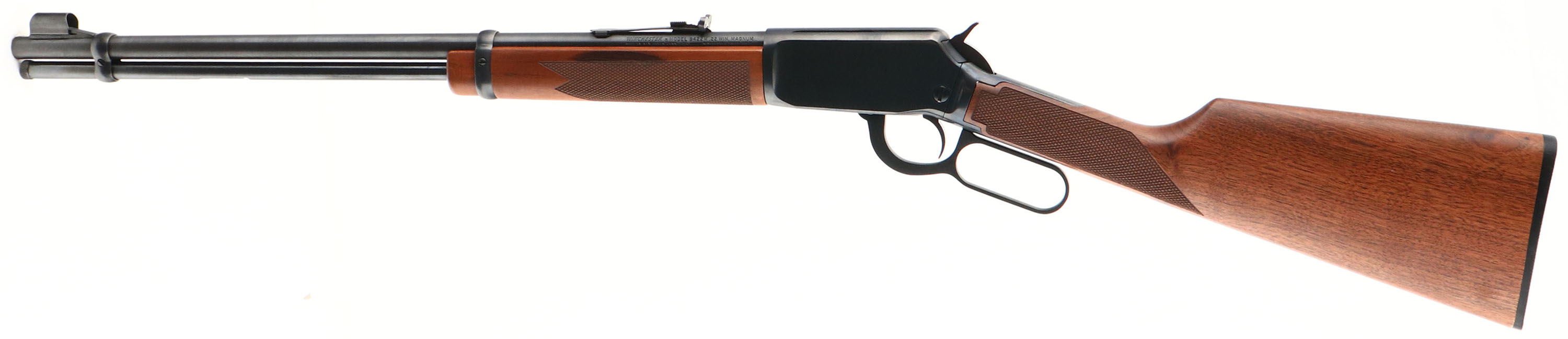 Winchester, Model 9422M Carbine, CAL: marked .22 WIN MAGNUM, MFG: 1974, SN: F663605, Lever Action Rifle, 20 1/4'' Round barrel. The checkered straight grip walnut stocks are excellent, near mint. The metal blue finish rates 99% overall. Bore is excellent. Barrel holds an adjustable rear elevator sight & large hood front sight. Buttstock carries a Winchester marked, checkered black plastic buttplate. Comes in the original factory box, with tissue, paperwork & hang tag, FFL or C&R Req - Value: 800 to 1200