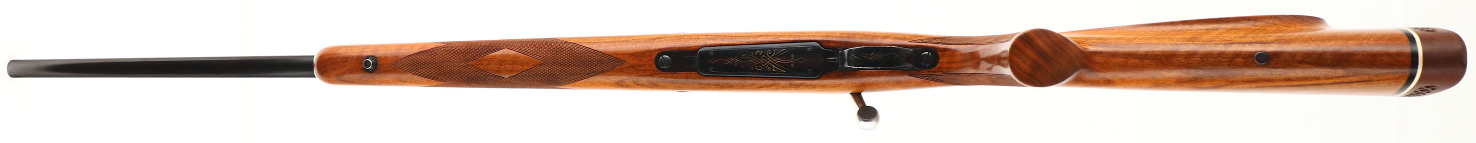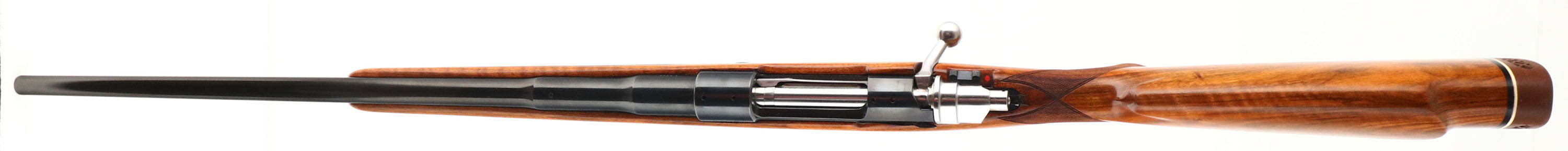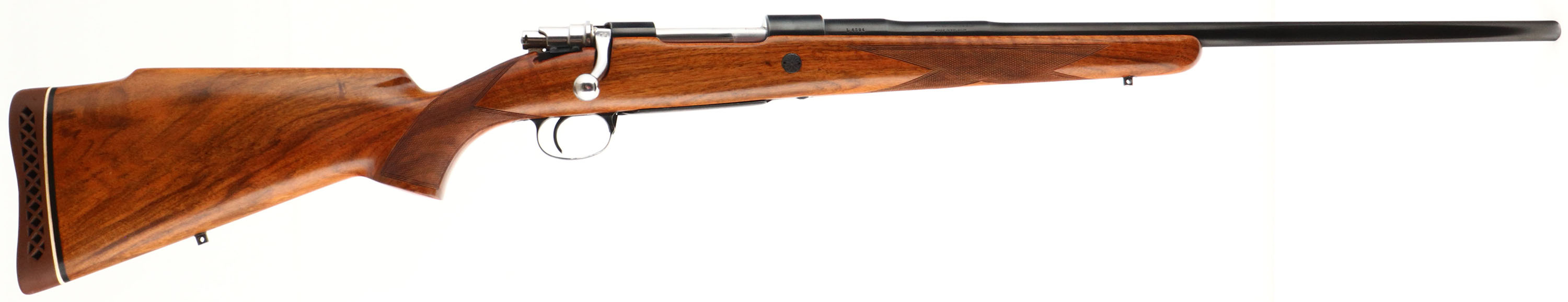 Browning, Model FN High-Power Safari Grade, marked Cal. 264 WIN. MAG. Only, MFG. 1959, Belgium, SN: L4394, Bolt Action Rifle, 24'' Round barrel, The factory checkered, cheeked & flat pistol grip Monte Carlo wood stock is excellent & original. There are just a couple very tiny finish level handling marks. The original metal blue rates 99% overall. Floorplate & trigger guard display fine gold tone engraving. Receiver has four open factory holes for scope mounting, while barrel has two factory screw filled rear sight hole & no front sight provision. Bore is excellent. Stock carries a ventilated Pachmayr recoil pad & sling stud provisions. An overall excellent, high original condition & collectible very early example. FFL or C&R Req. - Value: 1250 to 2500